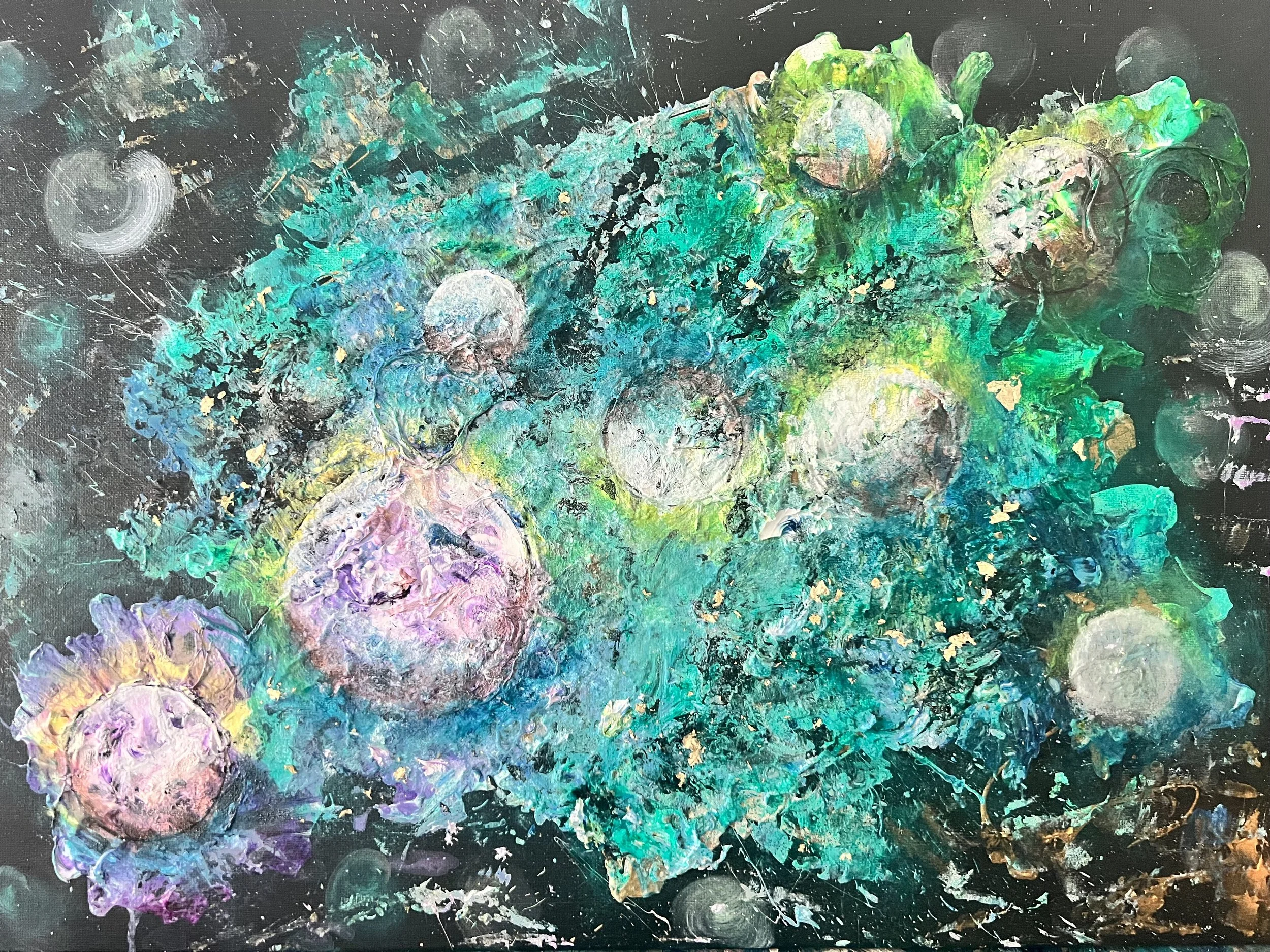 islas suspendidas, planetas sumergidos, constelaciones líquidas que laten como fragmentos de origen.