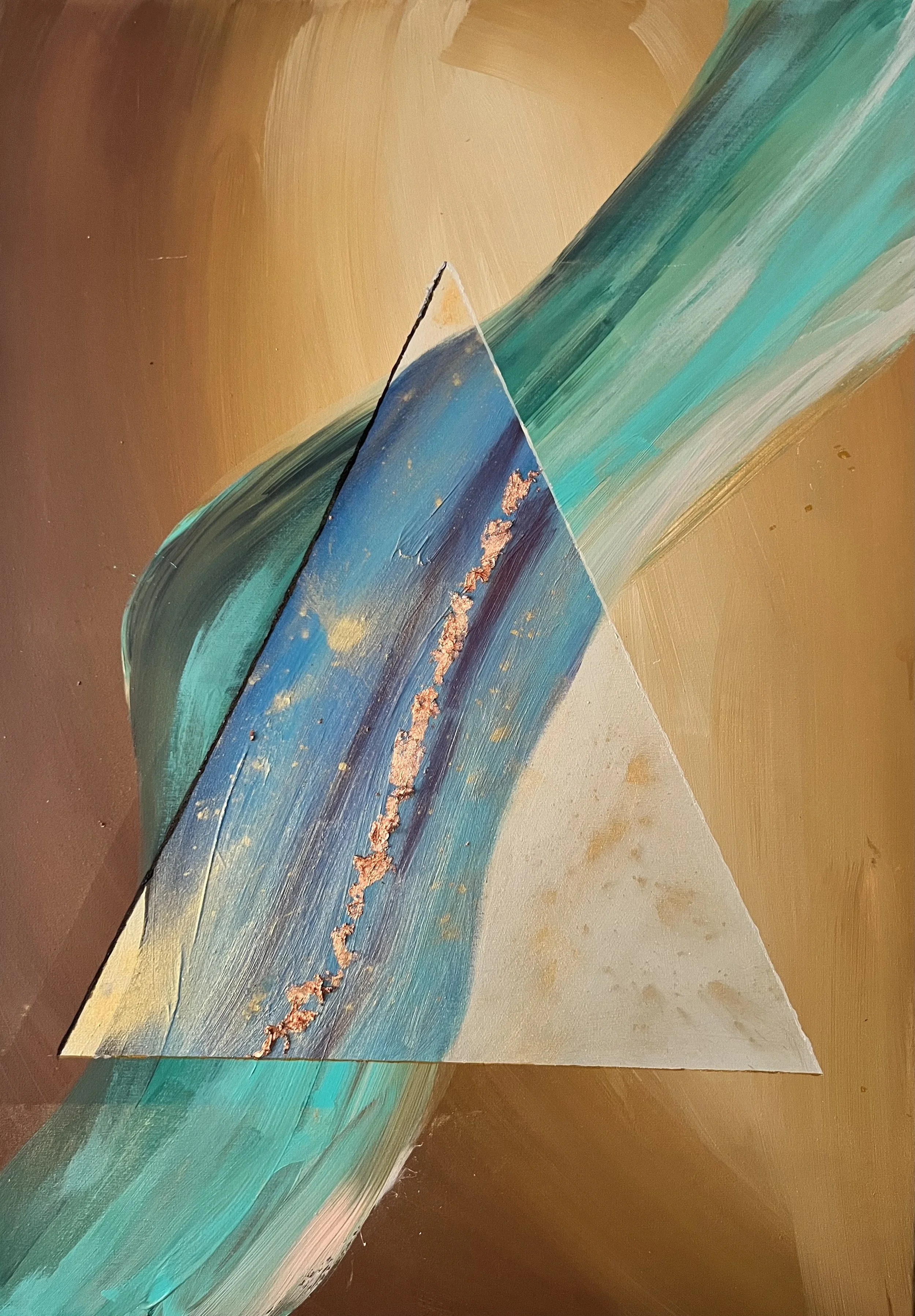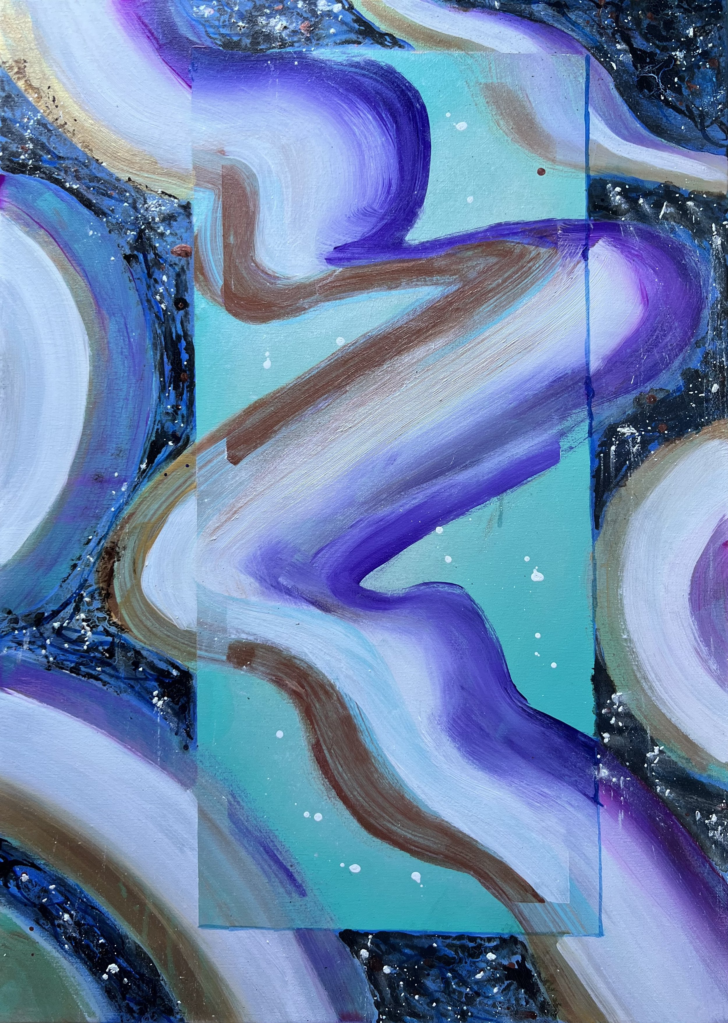 Las formas serpenteantes atraviesan el plano como caminos de ida y regreso: descensos suaves, ascensos contenidos. El color —azules, violetas y blancos— construye una atmósfera serena, mientras el pan de oro aparece de forma sutil, como un destello que no irrumpe, sino que acompaña. Esta pieza no habla de ruptura, sino de ritmo. De la capacidad de habitar dos estados a la vez: profundidad y claridad, pausa y movimiento.