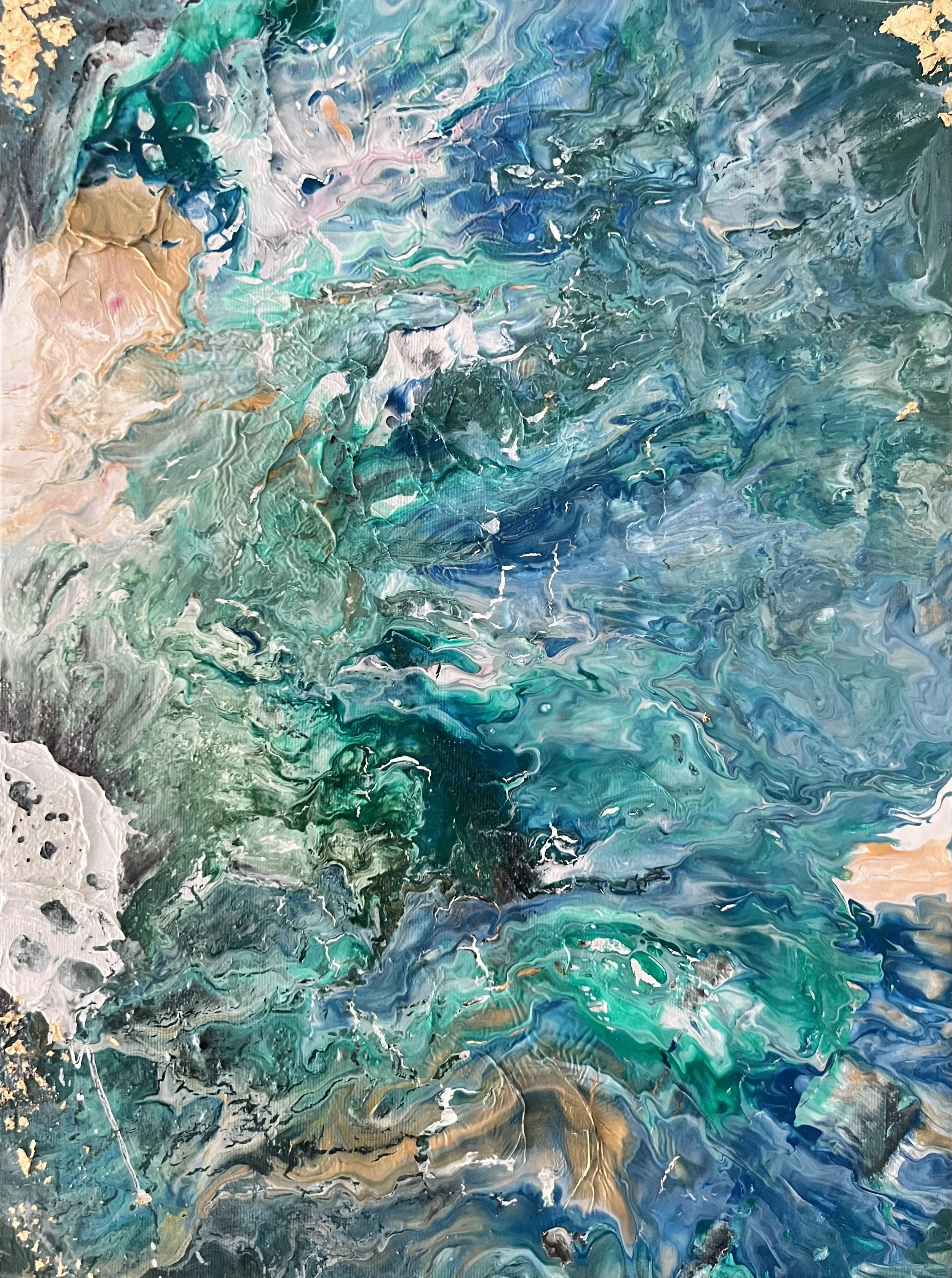 El color se despliega en capas fluidas de azules, verdes y blancos, atravesadas por acentos cálidos que activan la superficie sin romper su equilibrio. La materia, trabajada con pigmentos minerales y bicarbonato, genera texturas cambiantes que refuerzan la sensación de profundidad y transformación continua.
