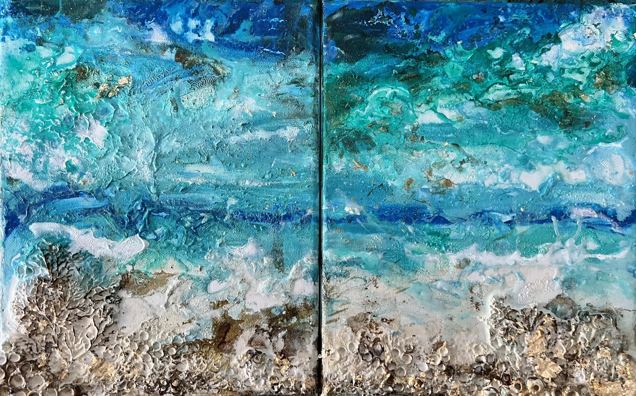 La obra está construida como un recuerdo en movimiento: las veladuras turquesas sugieren la distancia del océano, mientras que la arena y los blancos espumosos trazan la frontera íntima donde el agua se rompe y se reúne. Cada textura conserva la huella de ese regreso —una marea emocional que avanza, retrocede y vuelve a tocar.