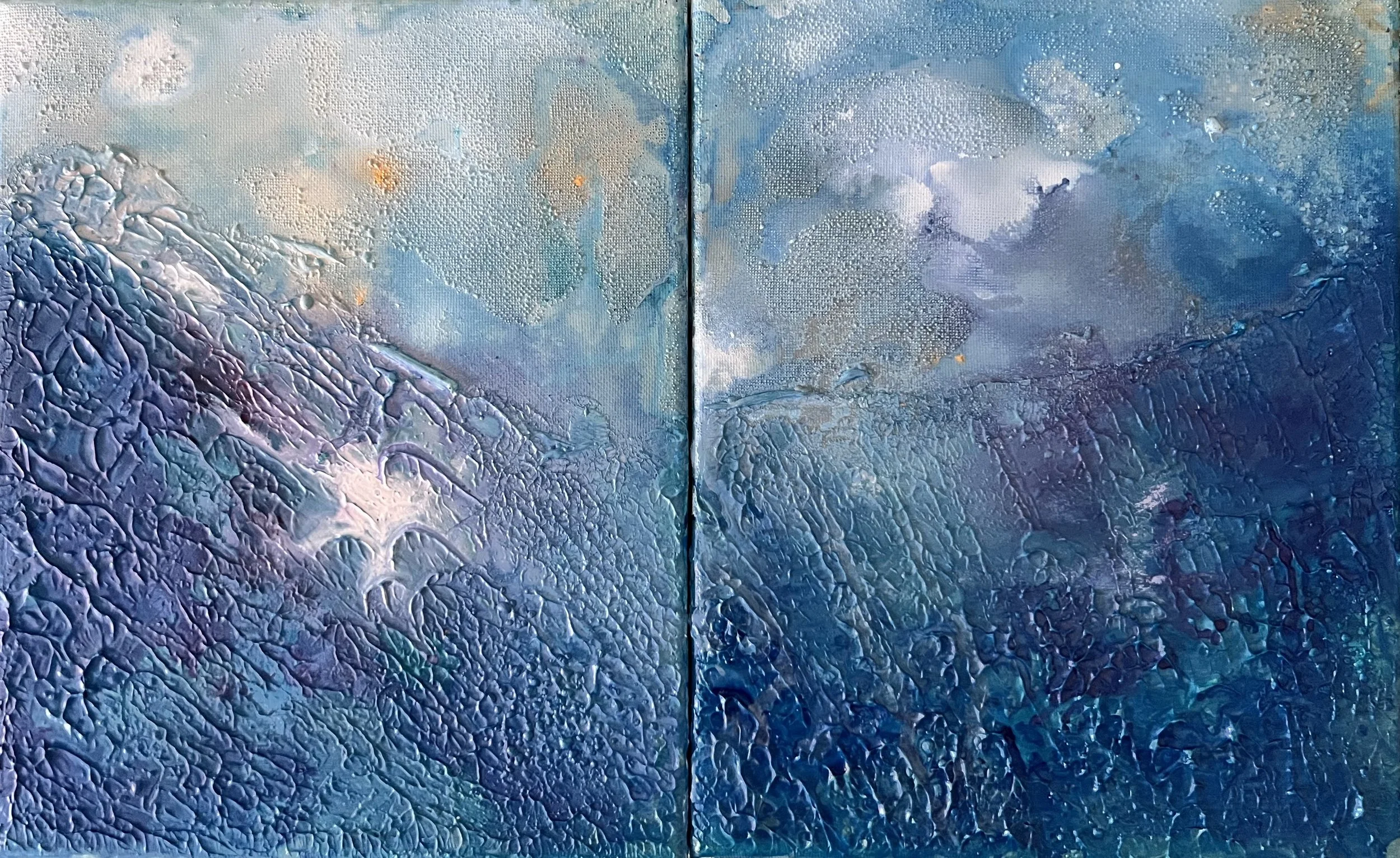Las veladuras fluidas crean un paisaje cambiante donde nada permanece fijo: el agua decide la forma. Es un díptico sobre aceptar el tiempo, aceptar lo que llega y lo que se va, como una estación que hace su trabajo.