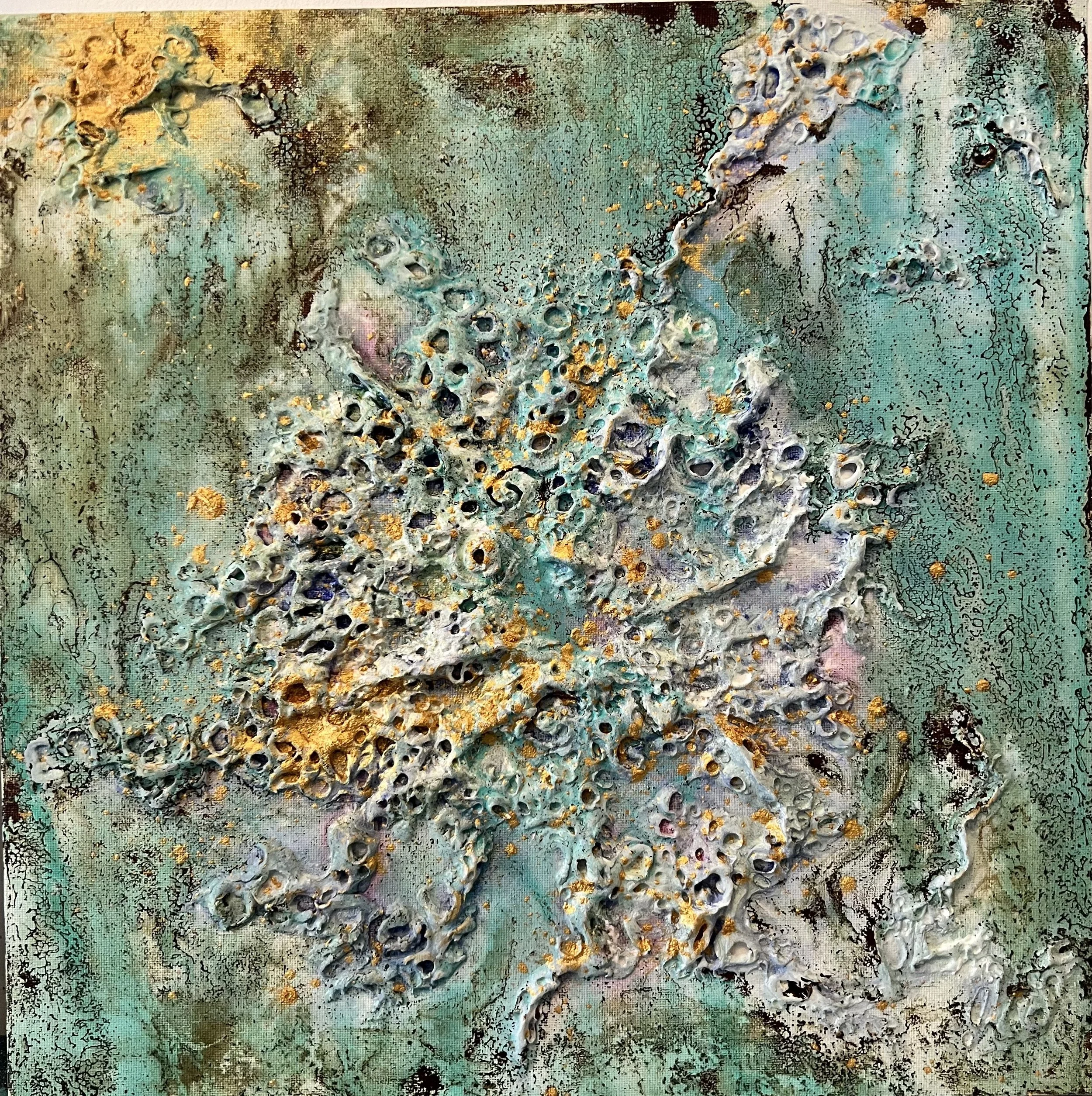 Los verdes, turquesas y óxidos se entrelazan como placas tectónicas recién nacidas, revelando una energía que empuja hacia afuera: impulso, movimiento, respiración primigenia.