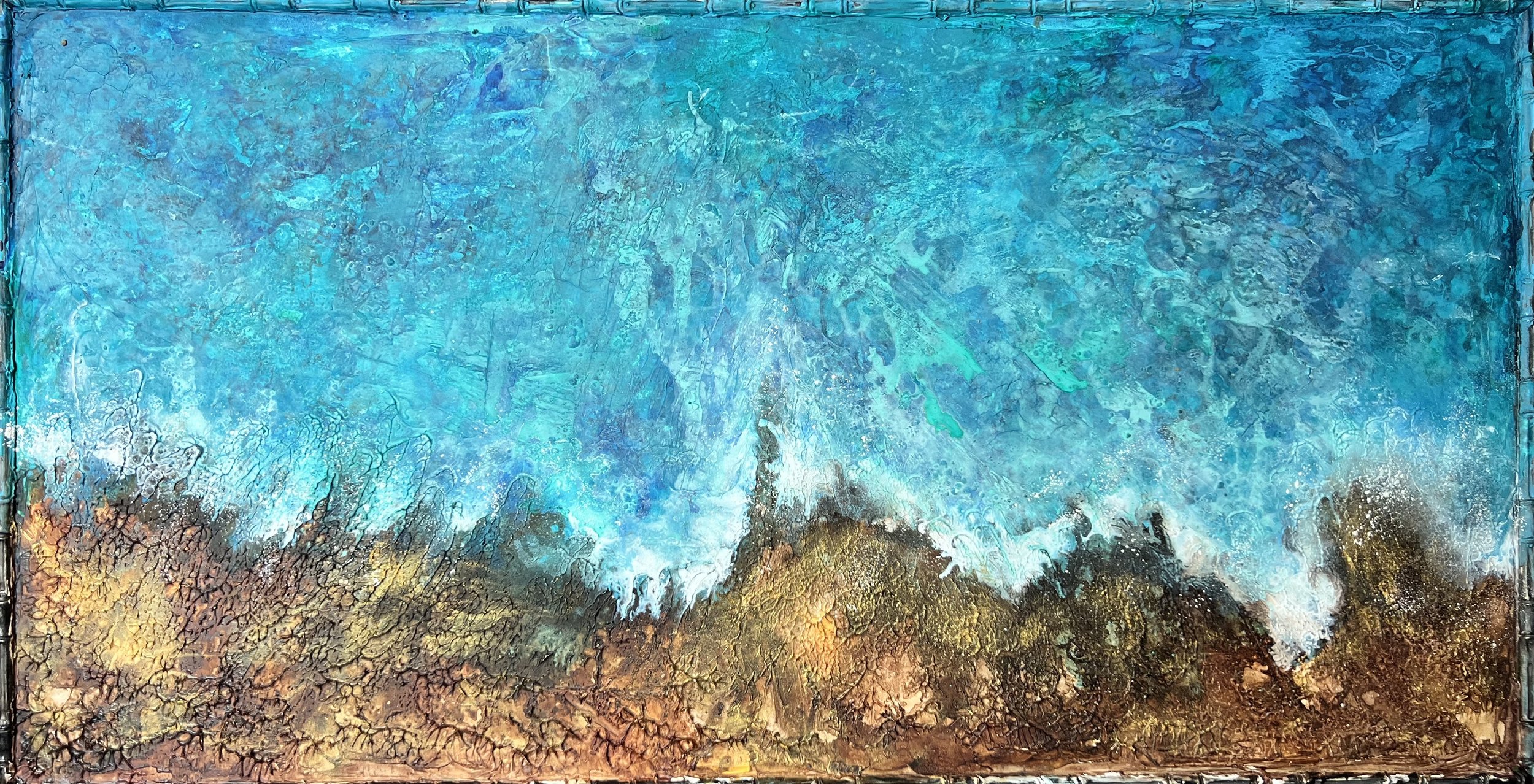 La pintura no describe un lugar concreto, sino una relación: empuje y resistencia, profundidad y arraigo. La superficie presenta una materia trabajada, con capas de gesso y pigmento que construyen un relieve irregular, donde el color se sedimenta y la luz queda atrapada en la textura.