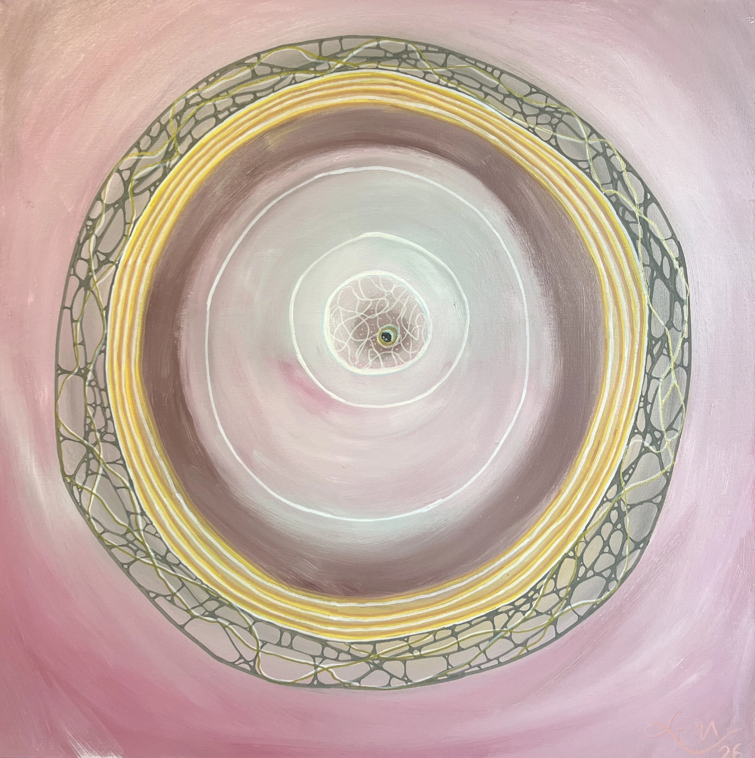 La forma inicial genera anillos sucesivos que se expanden sin perder coherencia, manteniendo la tensión entre centro y campo.