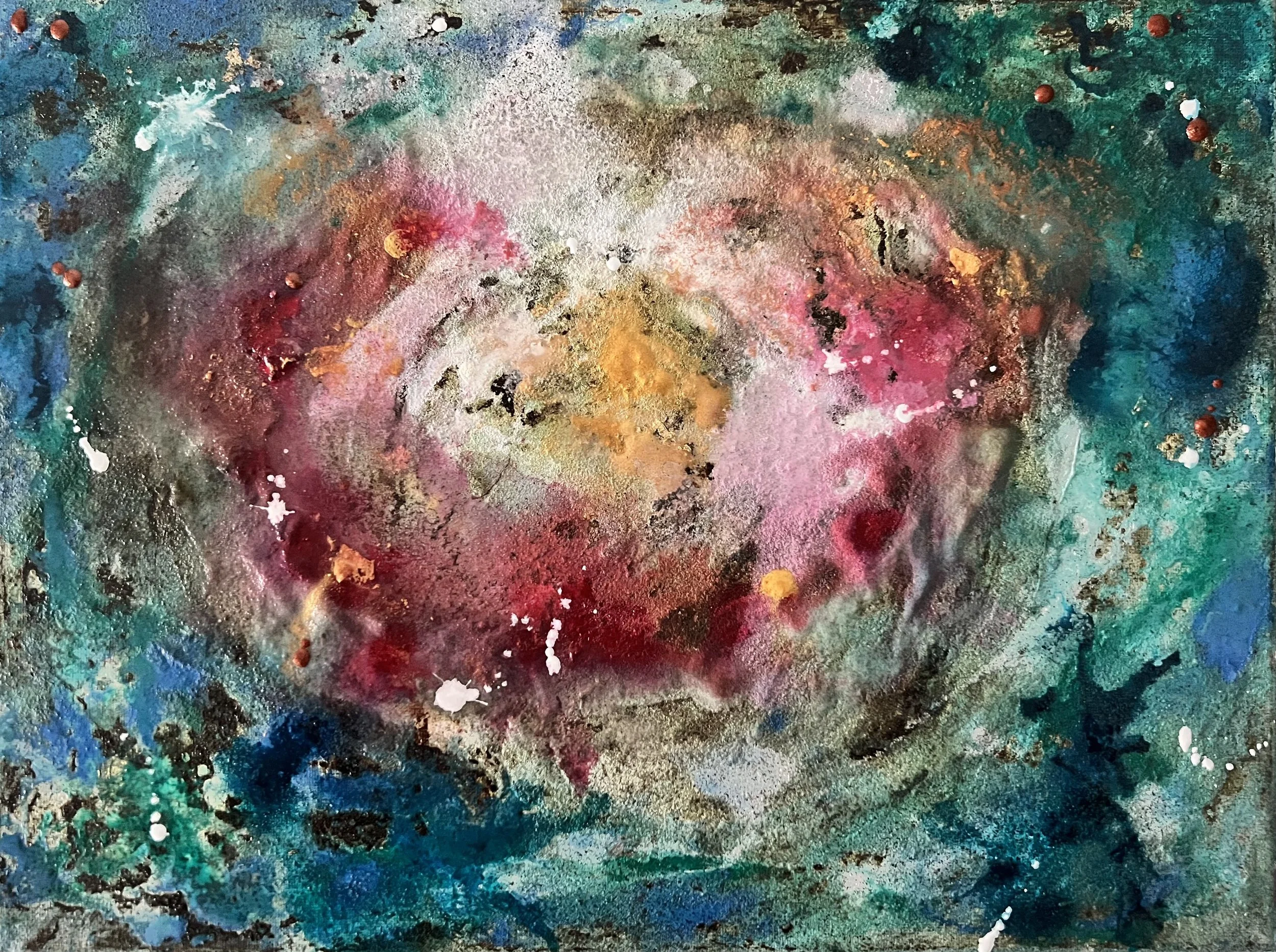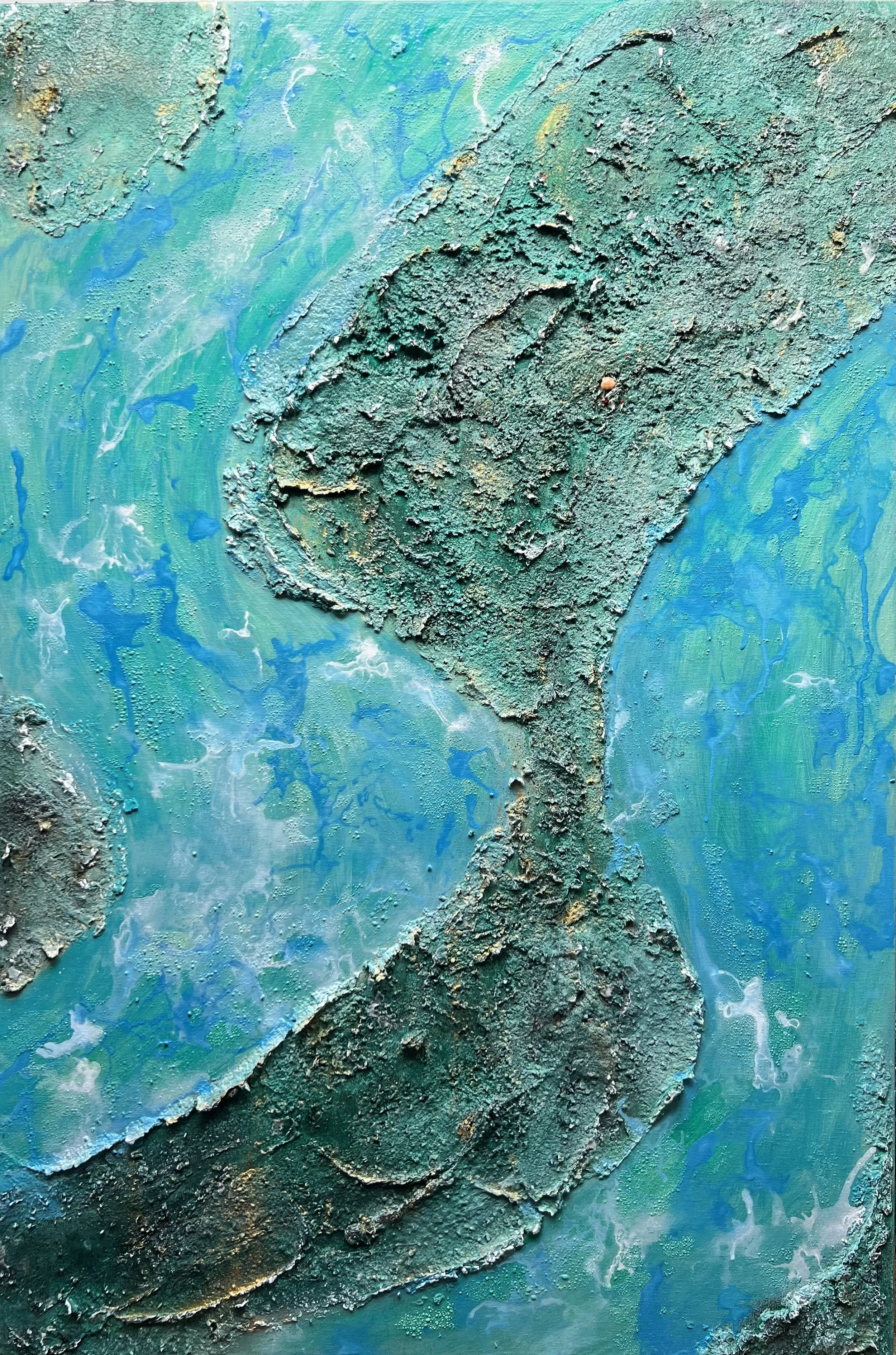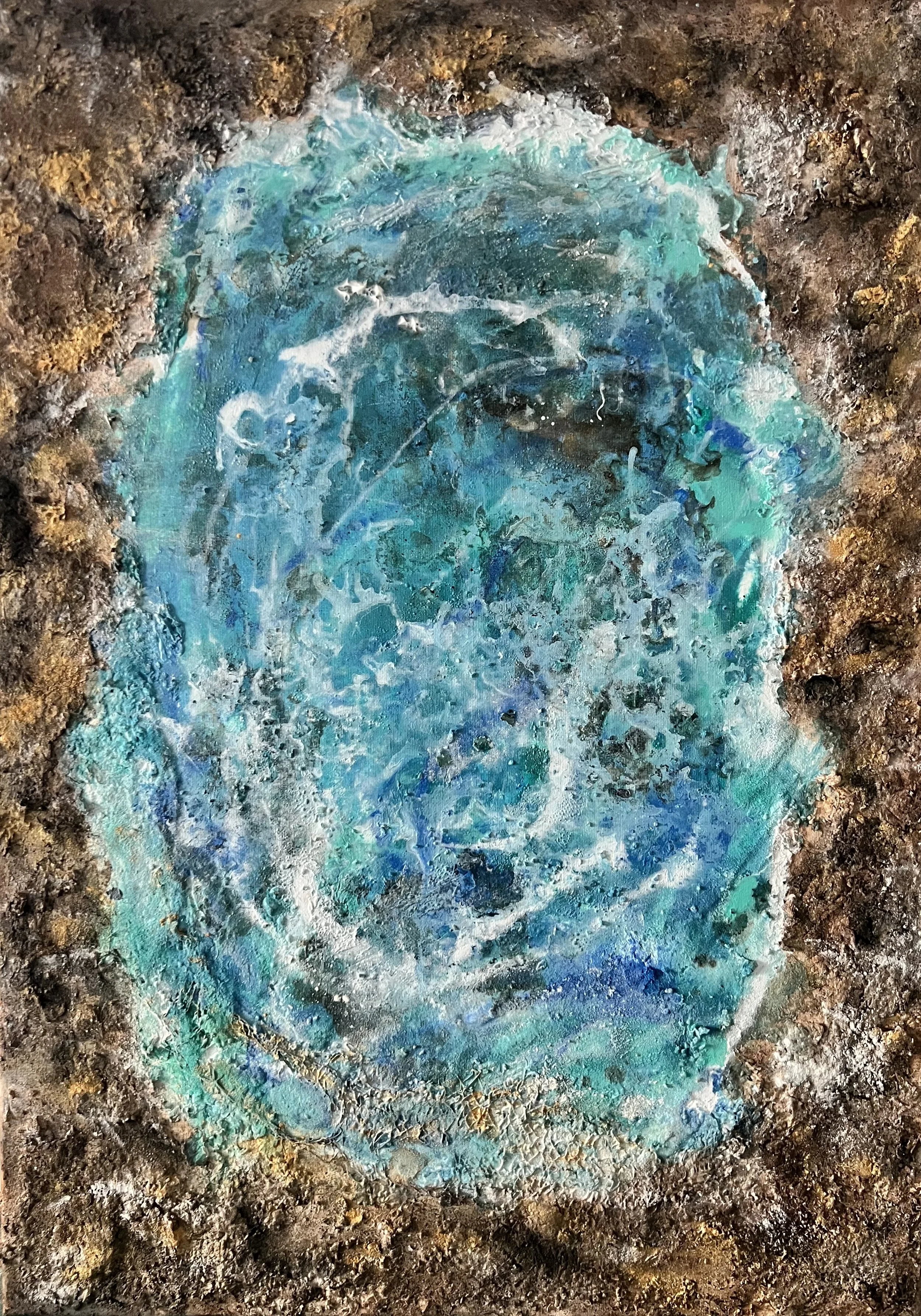 Niña es una visión desde dentro: una pupila oceánica que guarda memoria y origen. La forma central, suspendida en azules profundos y veladuras turquesa, late como un núcleo protegido, un ojo que observa y a la vez se abre al mundo.