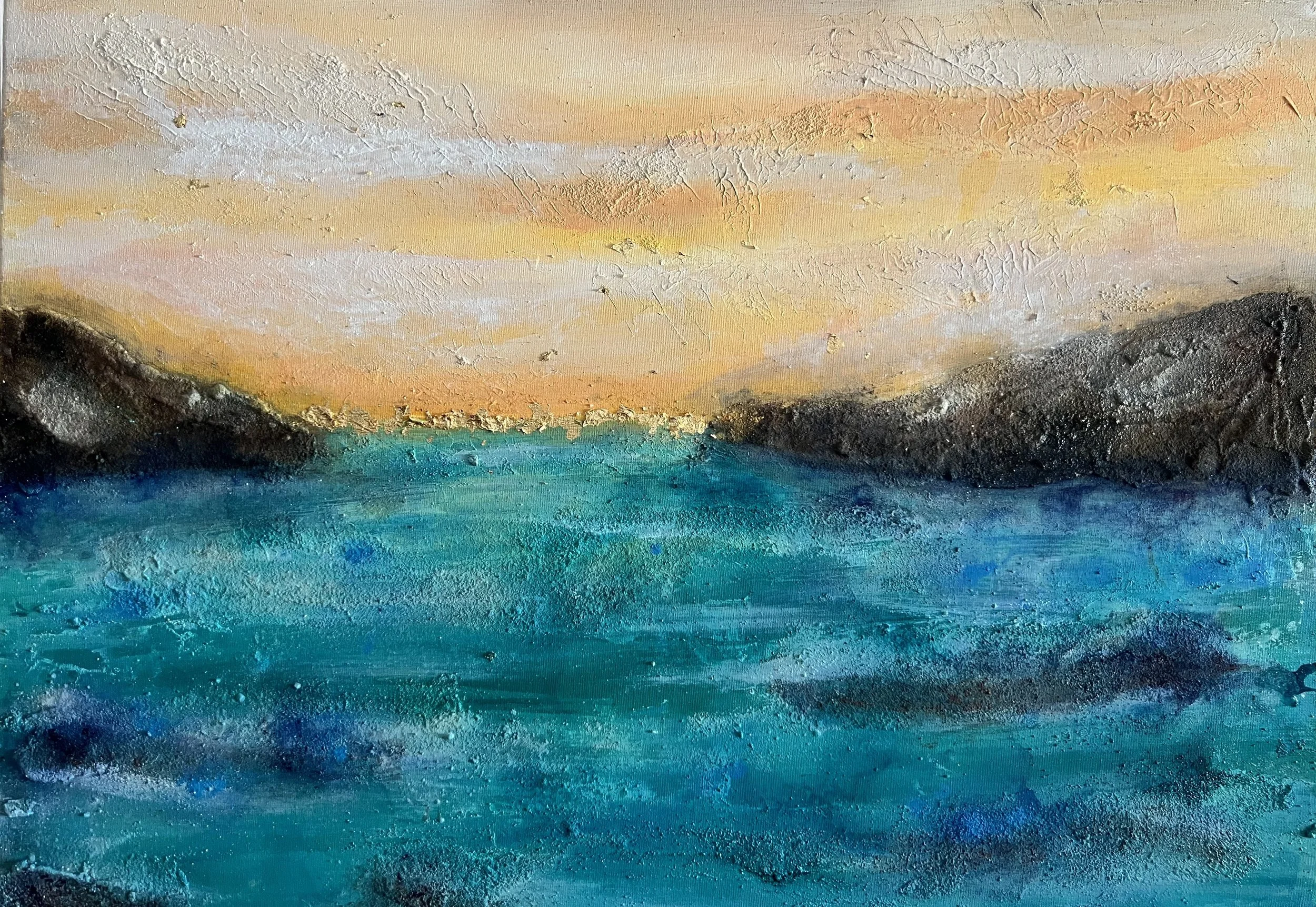 Lembranza es un territorio suspendido entre lo que fue y lo que aún permanece. La obra se despliega como una orilla de memoria, donde el agua guarda huellas antiguas y el oro cae como un sol que insiste en volver.