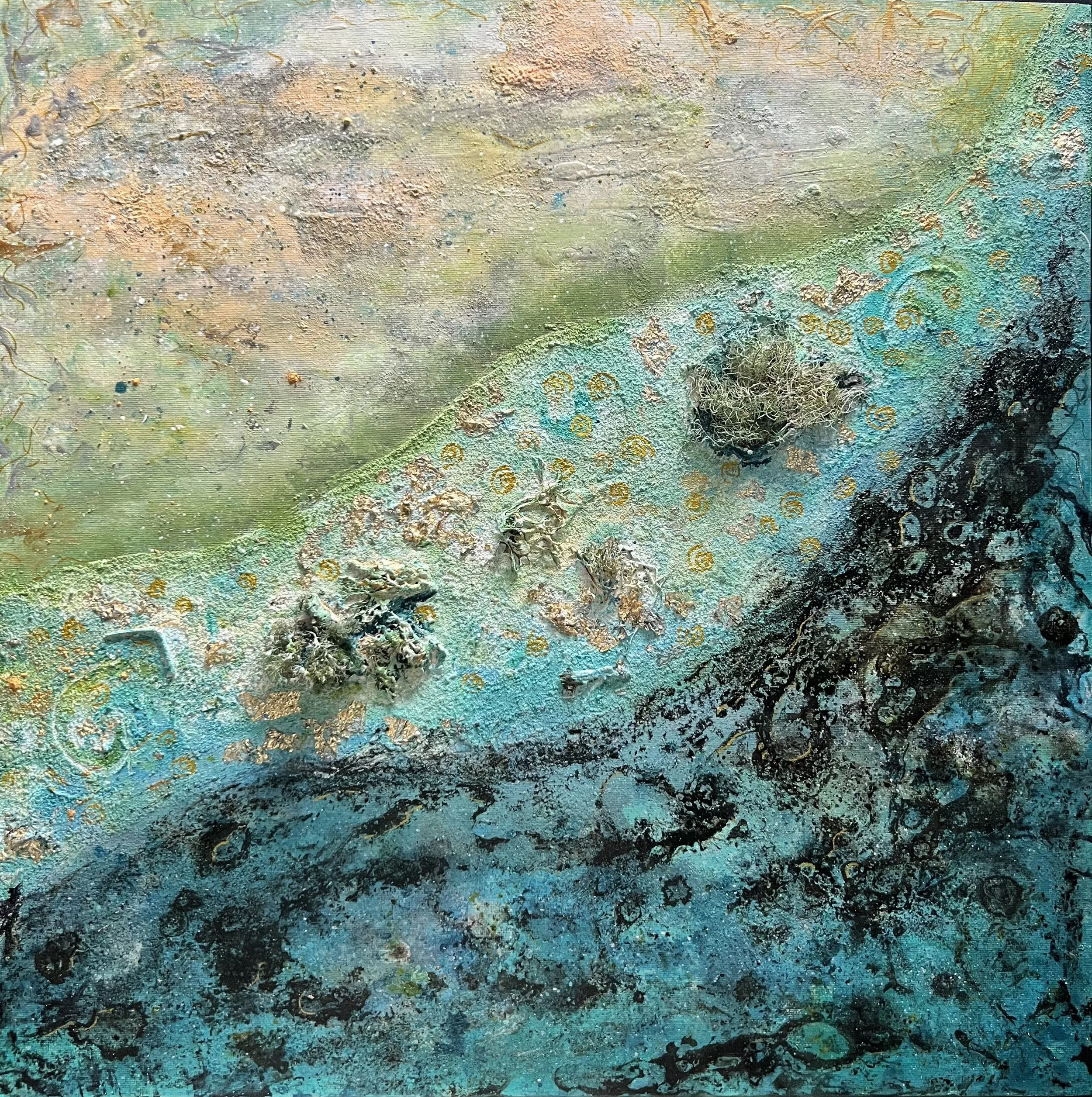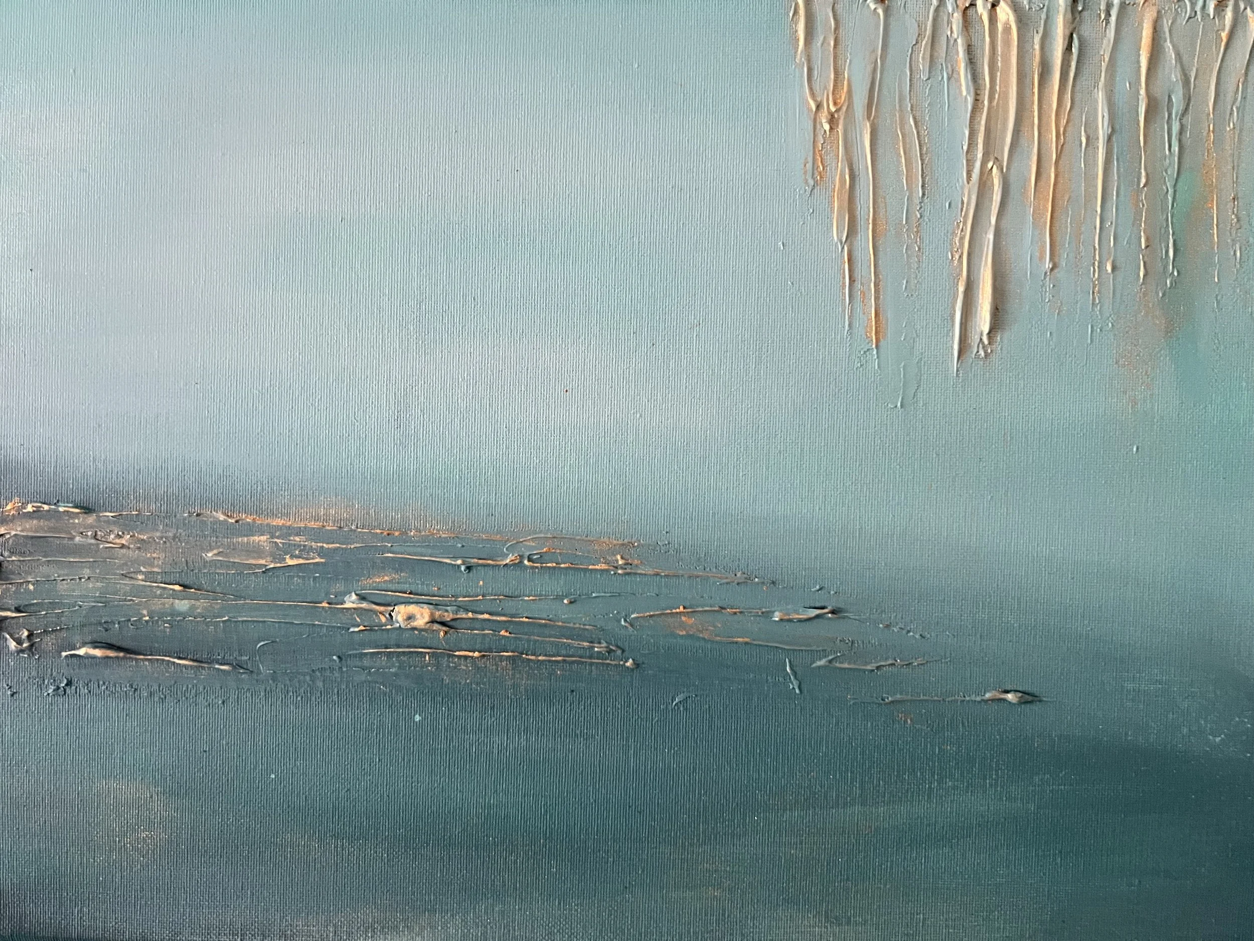Las texturas —rugosas, heridas, luminosas— funcionan como capas de recuerdo: lo que la vida arrastró y lo que decidió quedarse. El azul verdoso abre profundidad; los verticales dorados descienden como ecos que no se apagan.
