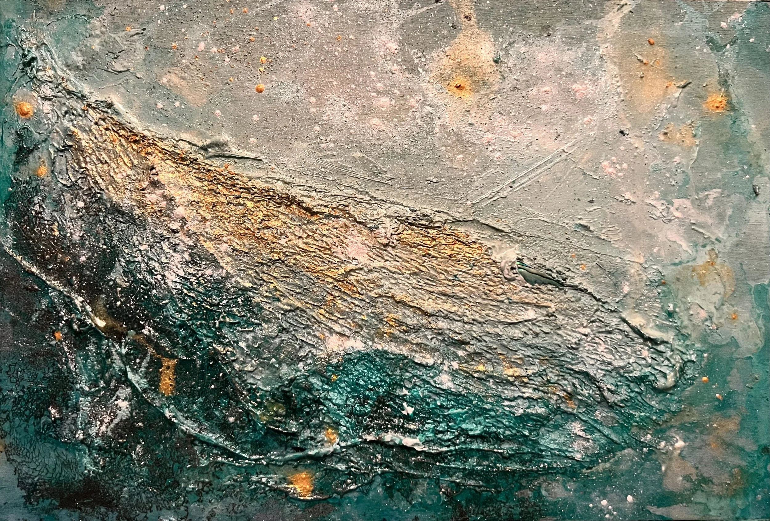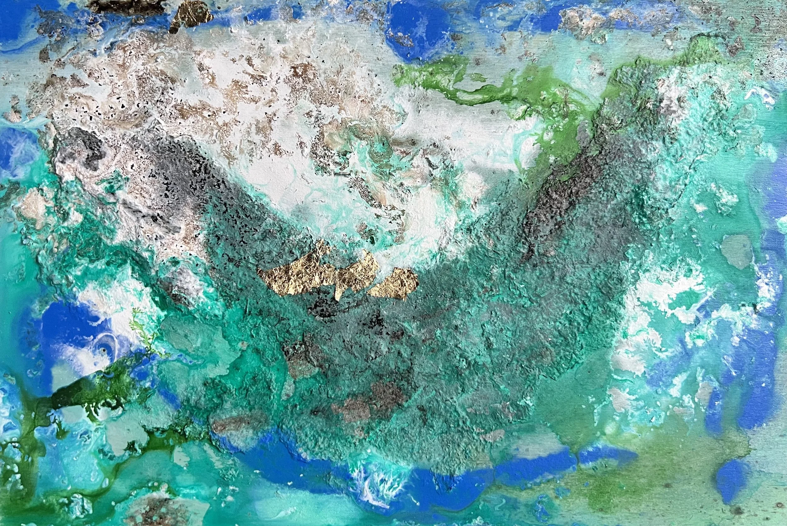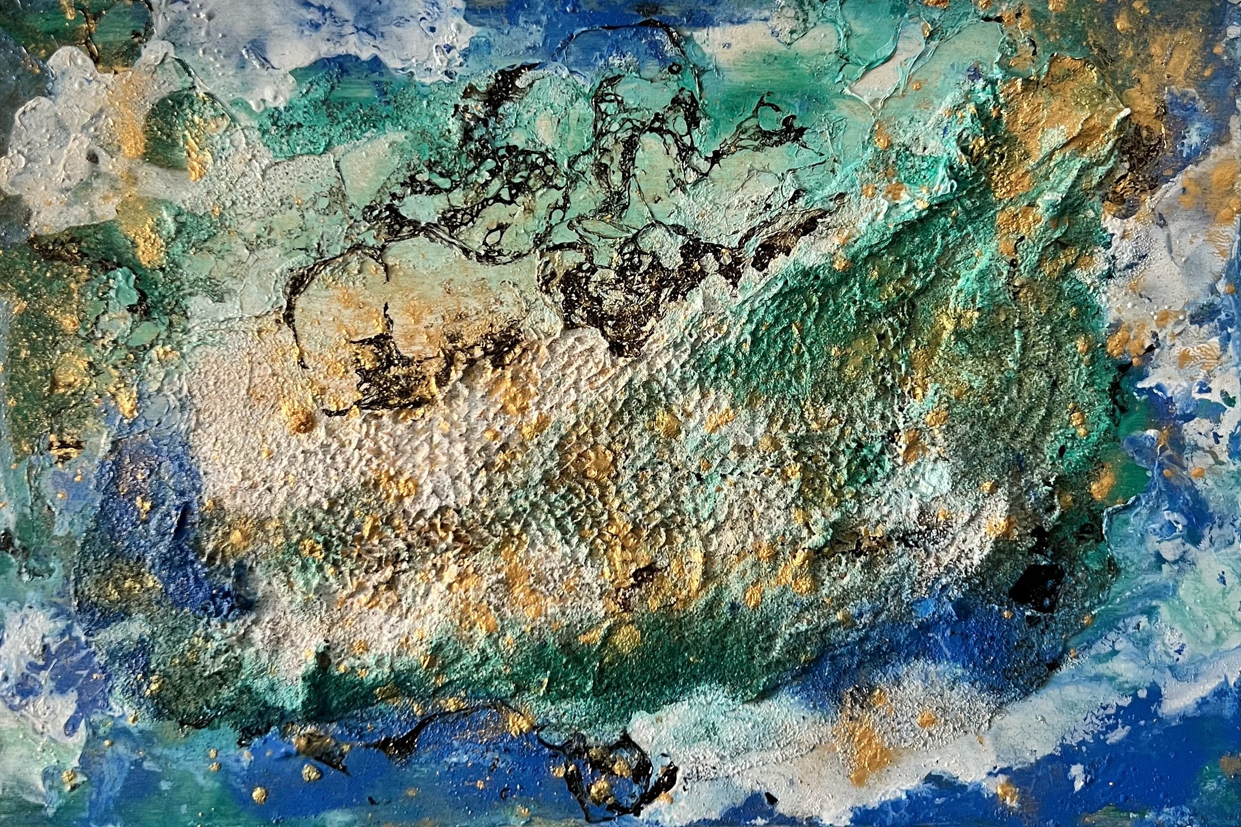 Las veladuras verdes, turquesas y los destellos dorados evocan corrientes suaves que no arrastran, sino que envuelven. Cada relieve funciona como una traza vegetal, como una raíz marina que se estira, se enreda y vuelve a nacer. Es un paisaje íntimo, casi oculto, donde la luz queda atrapada y se libera en fragmentos móviles.