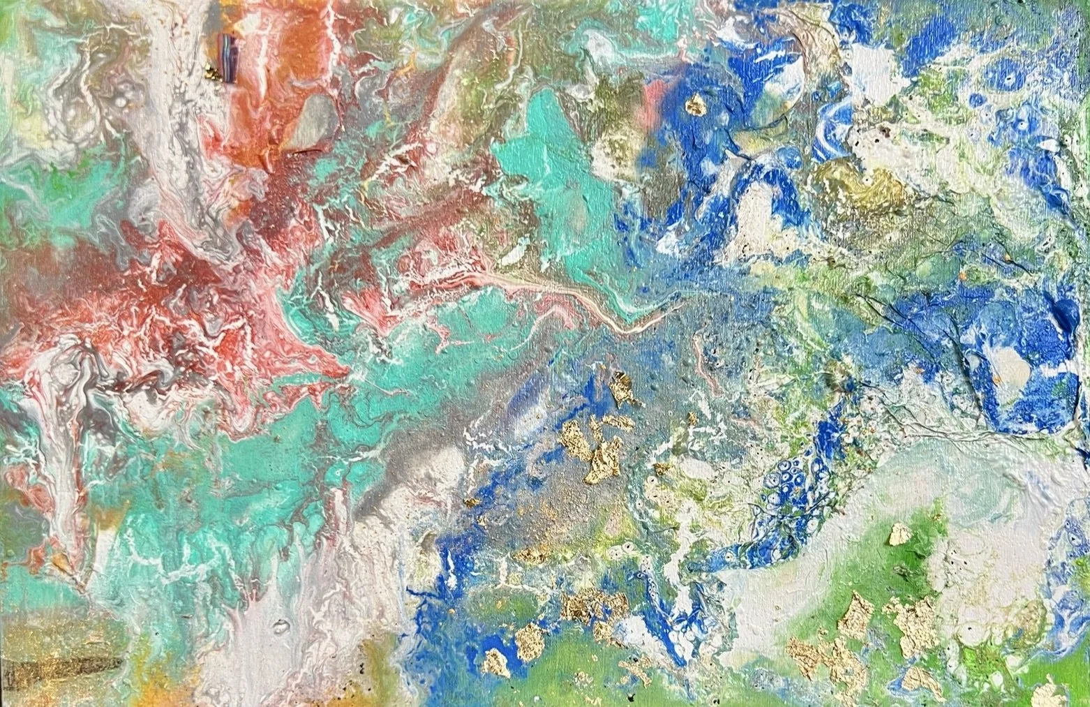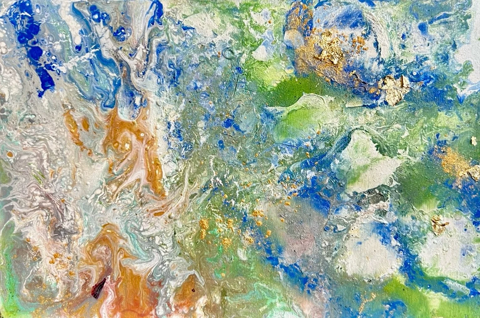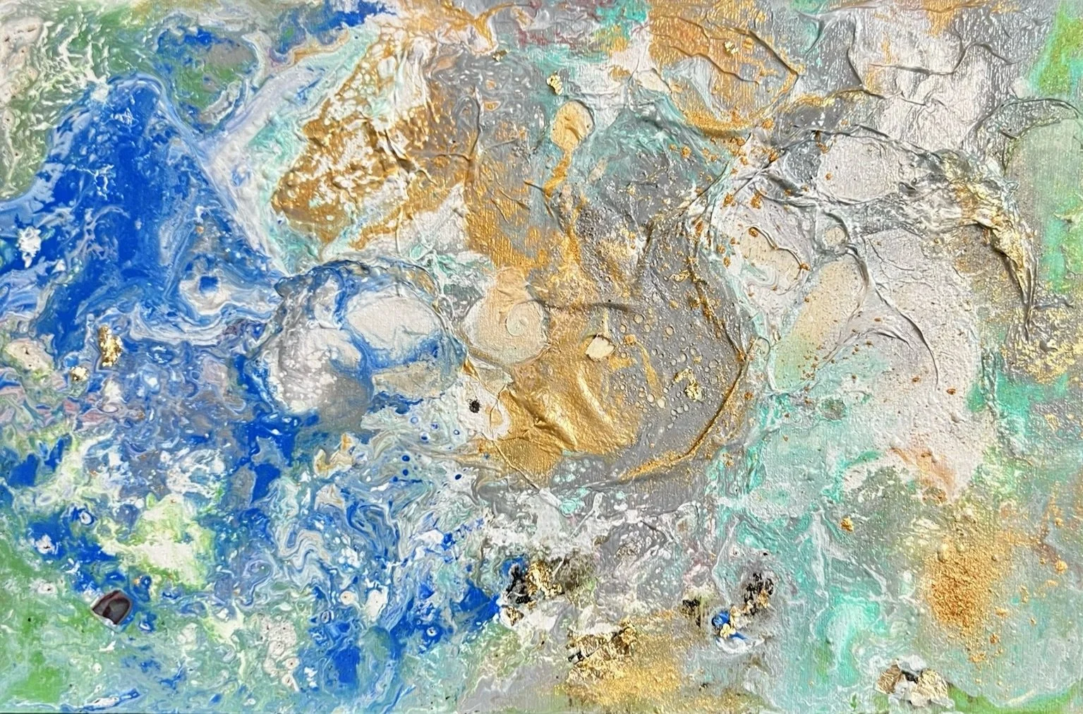Las veladuras verdes, turquesas y los destellos dorados evocan corrientes suaves que no arrastran, sino que envuelven. Cada relieve funciona como una traza vegetal, como una raíz marina que se estira, se enreda y vuelve a nacer. Es un paisaje íntimo, casi oculto, donde la luz queda atrapada y se libera en fragmentos móviles.
