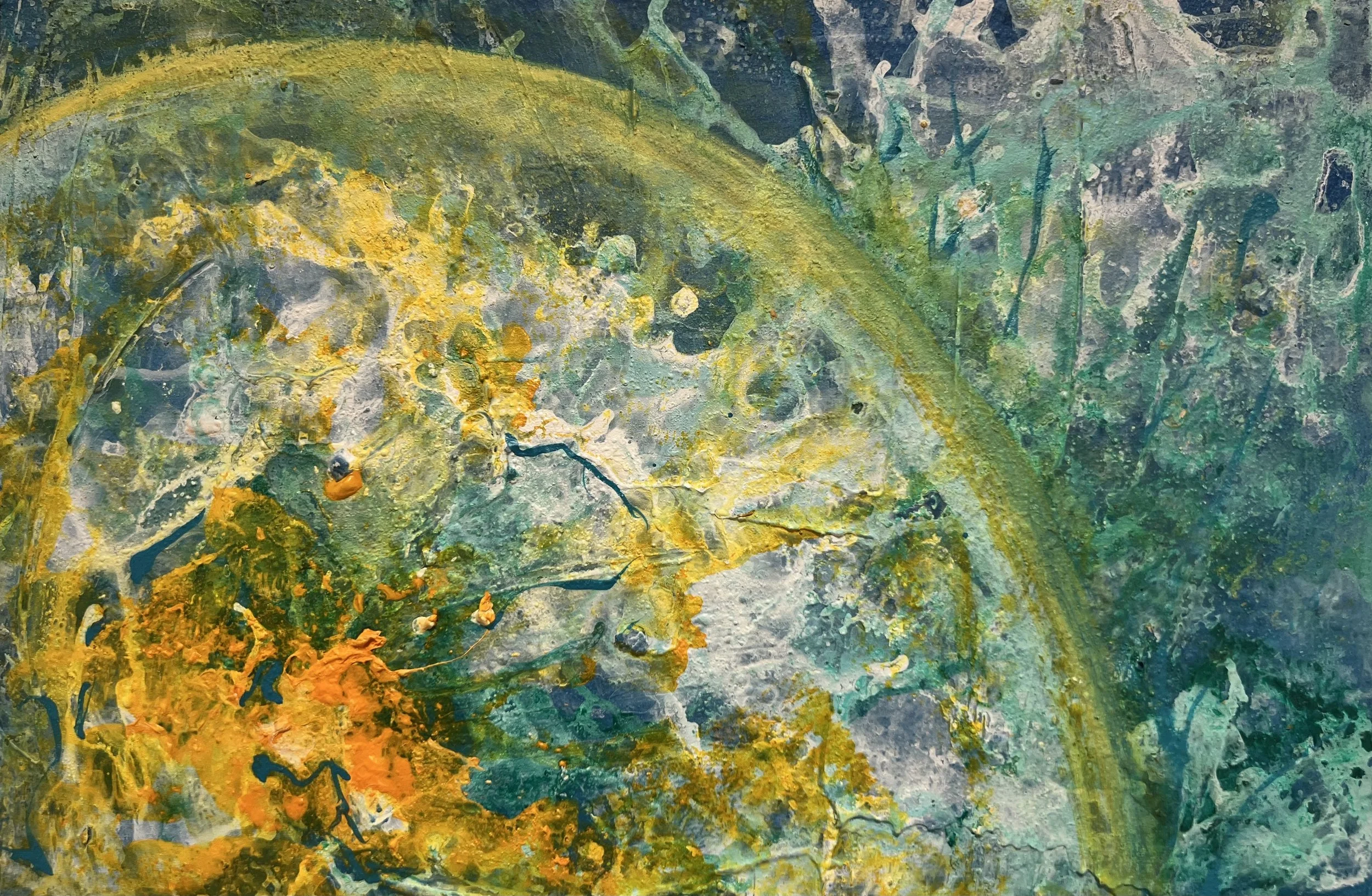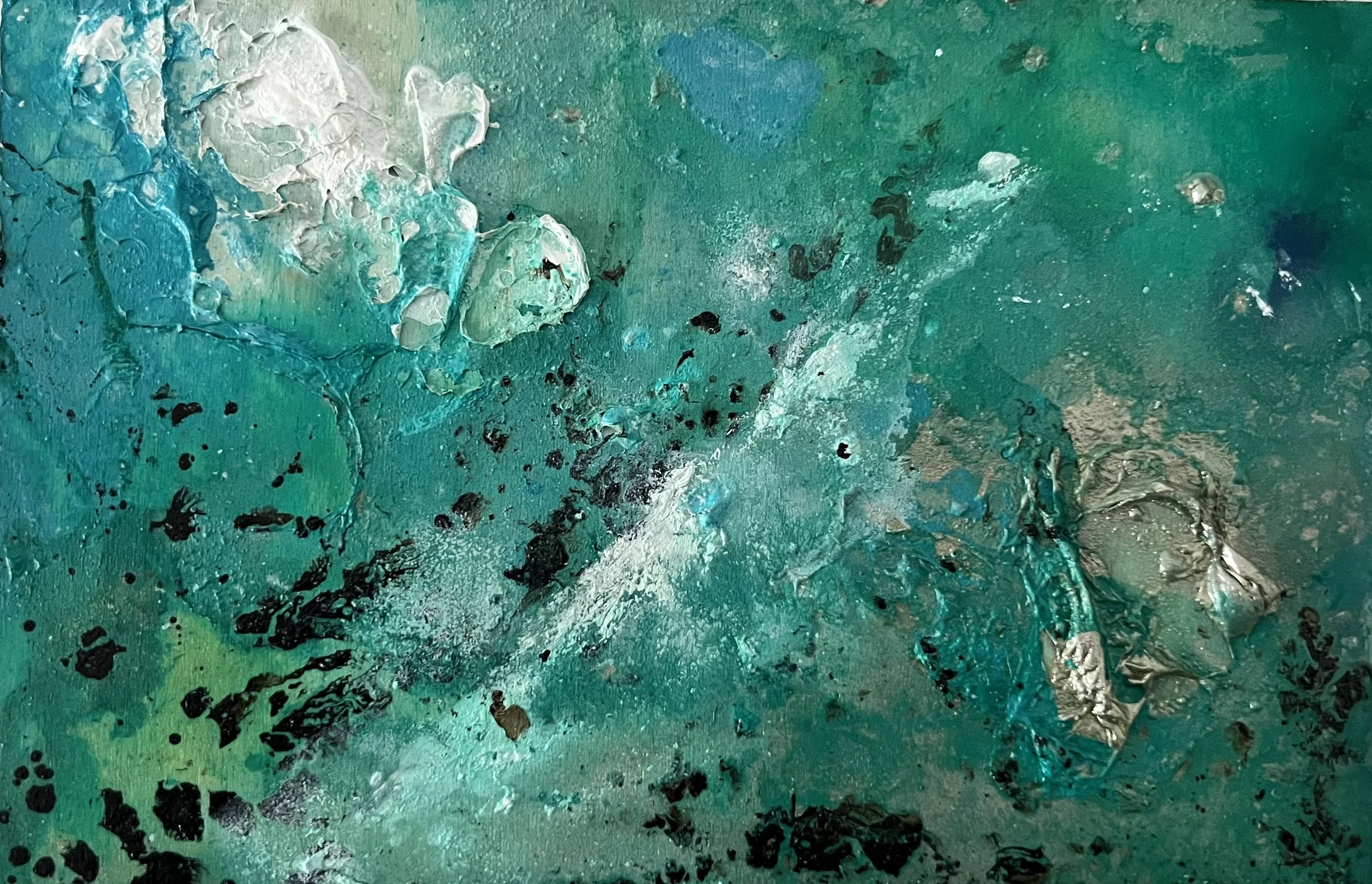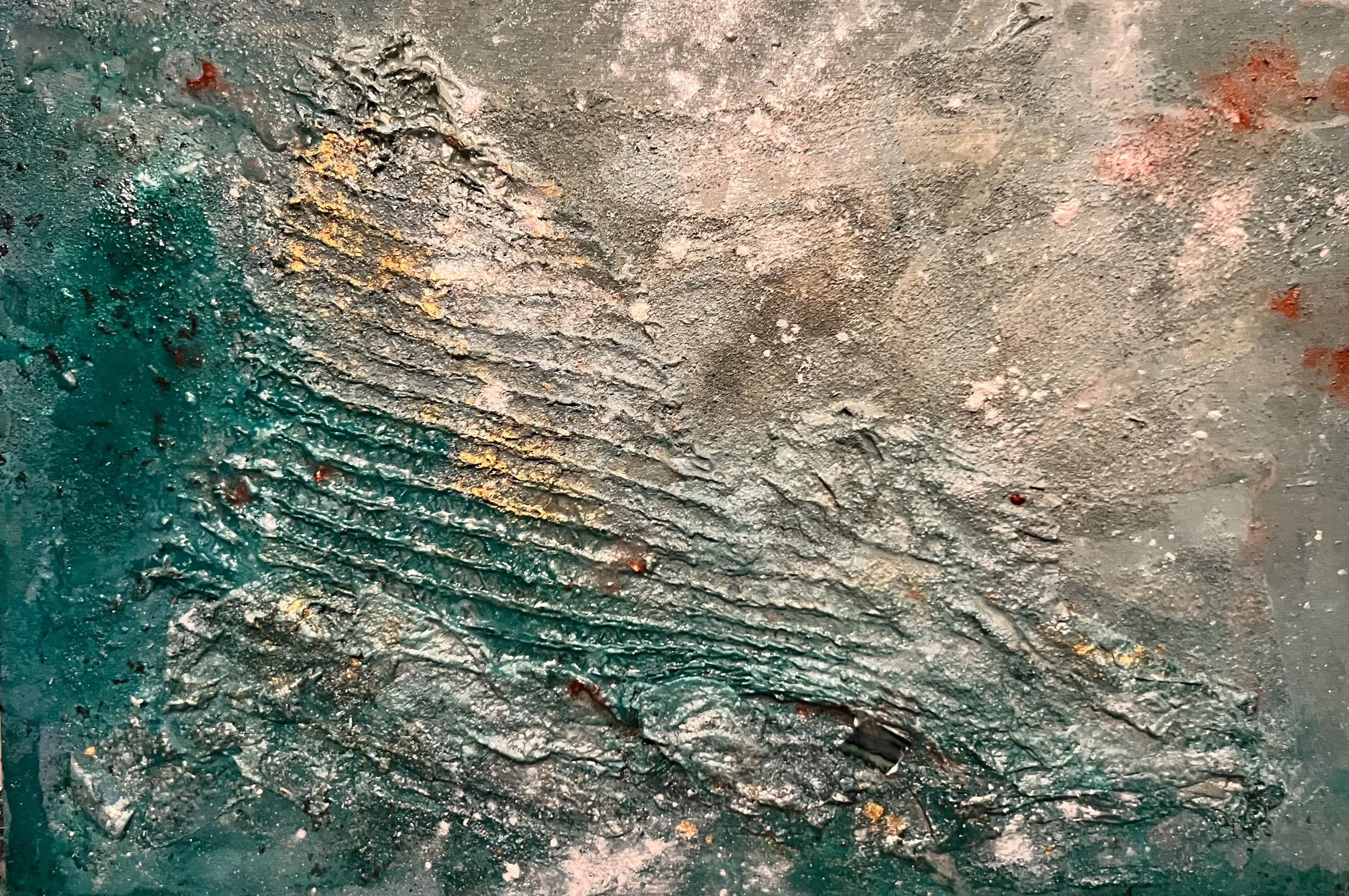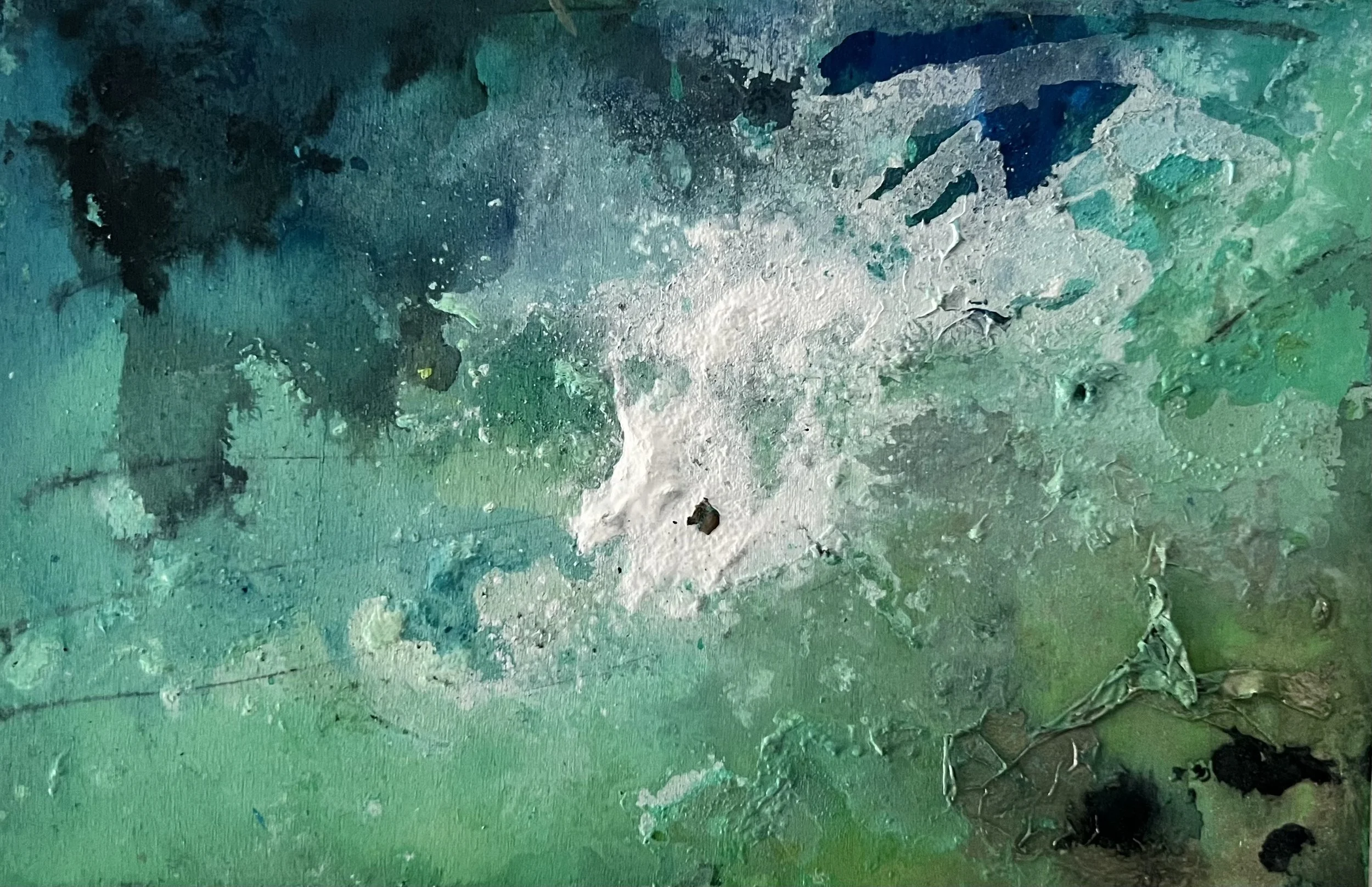 Los verdes abisales y los turquesas erosionados evocan frecuencias bajas, íntimas, que ascienden como un rumor líquido. La obra trabaja en la frontera entre lo visible y lo velado: aquí la luz se mezcla con sedimentos antiguos que vuelven a emerger.