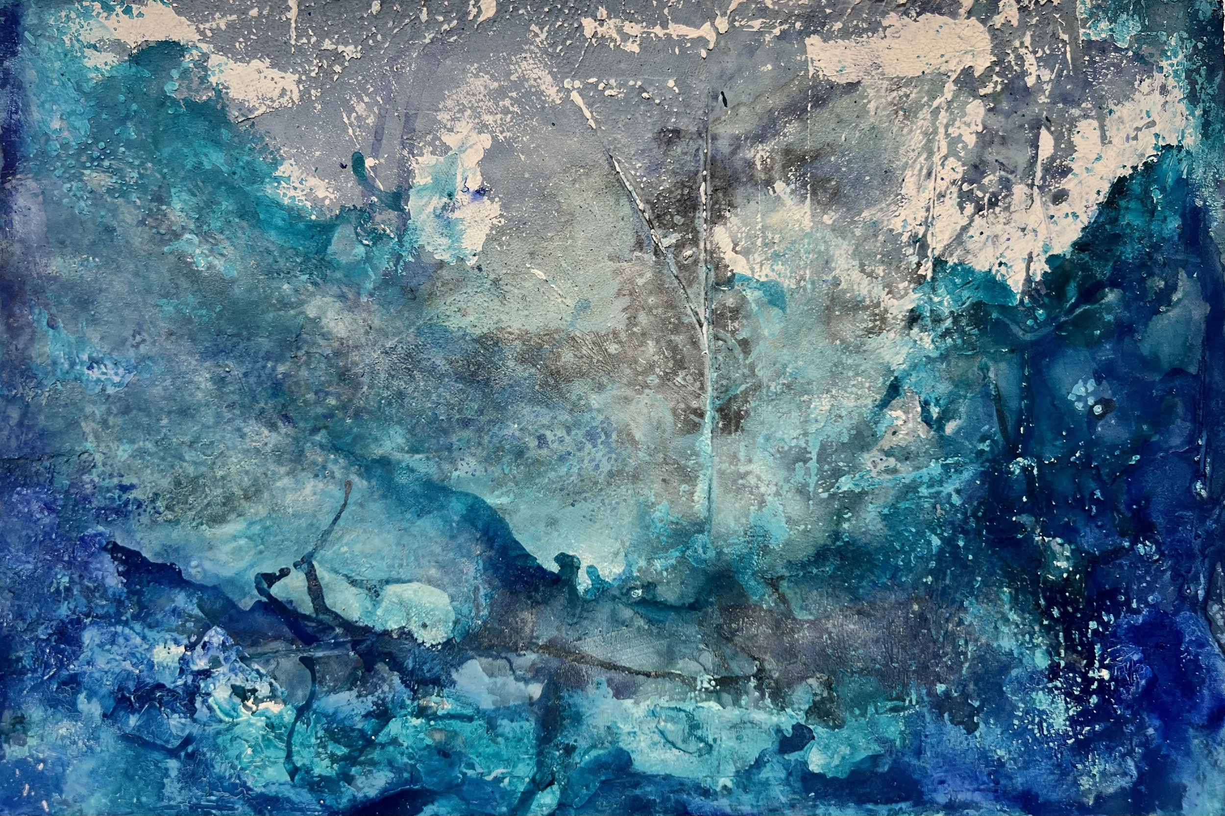 La materia se despliega en azules profundos y turquesas, creando un paisaje interior que remite al mar, a la distancia y a la memoria. Las capas y veladuras generan un horizonte difuso donde la pintura avanza y se recoge, como una travesía silenciosa.