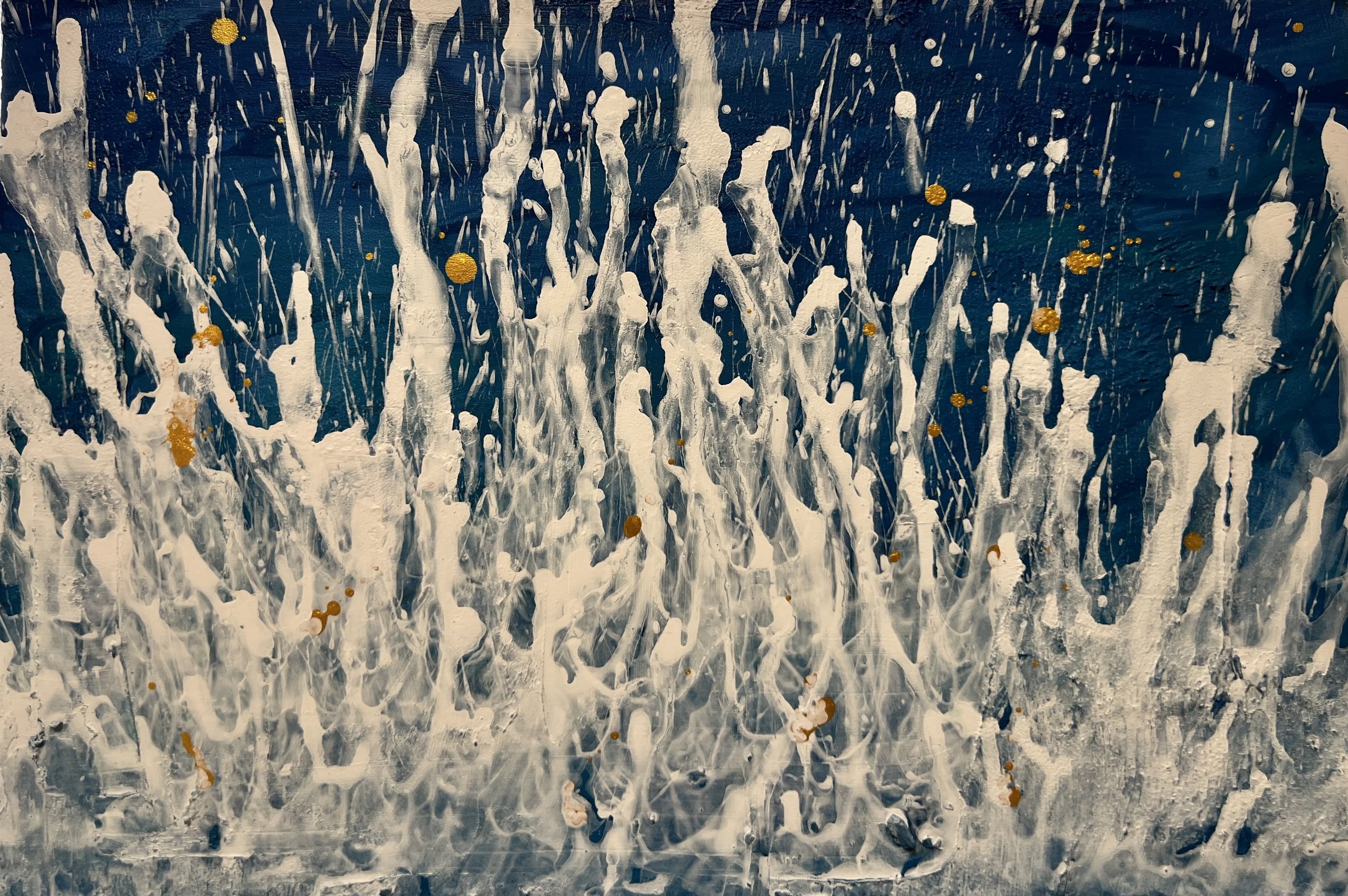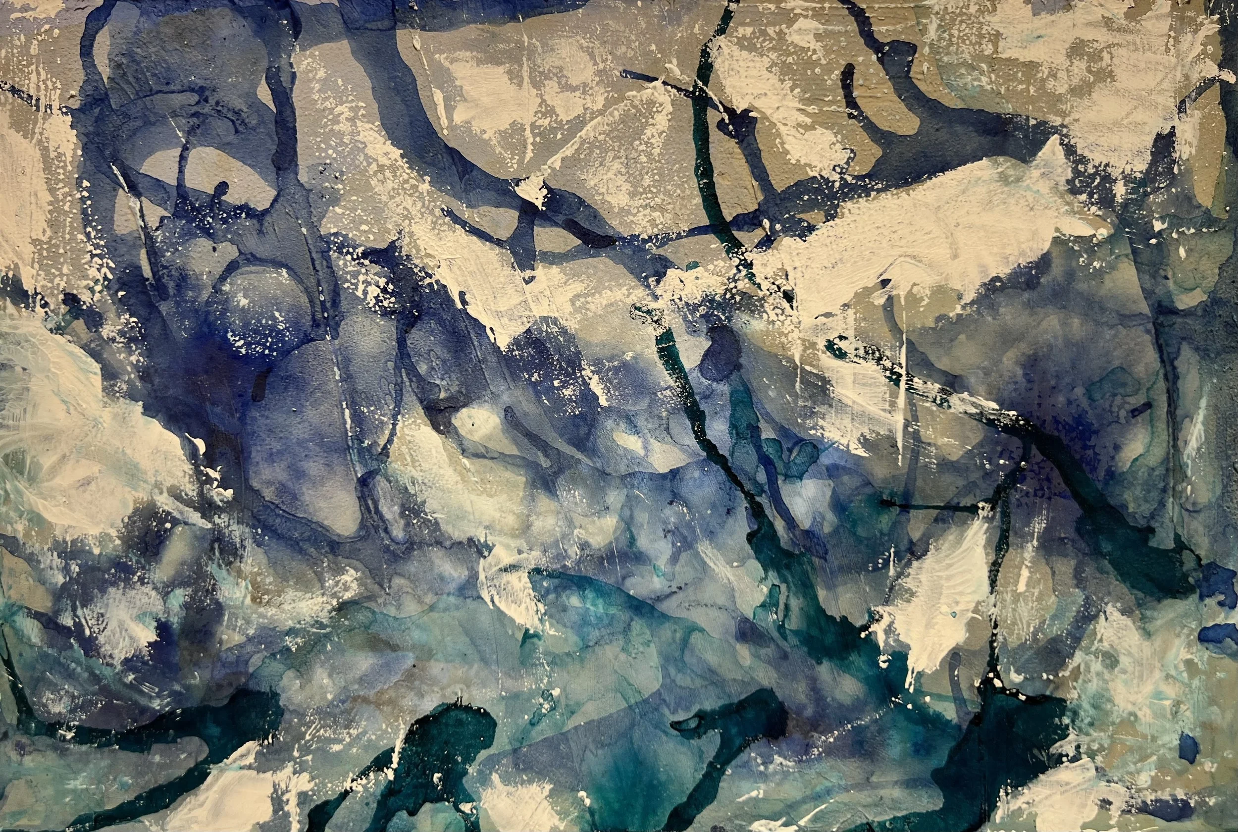Las veladuras fluidas generan un paisaje en movimiento: cada trazo recoge la fricción entre masas de agua diferentes, un rumor cálido que asciende desde el sur y una corriente fría que llega del oeste. El relieve mineral funciona aquí como cartografía viva: líneas que se abren, grietas que se iluminan, territorios que emergen y se deshacen.