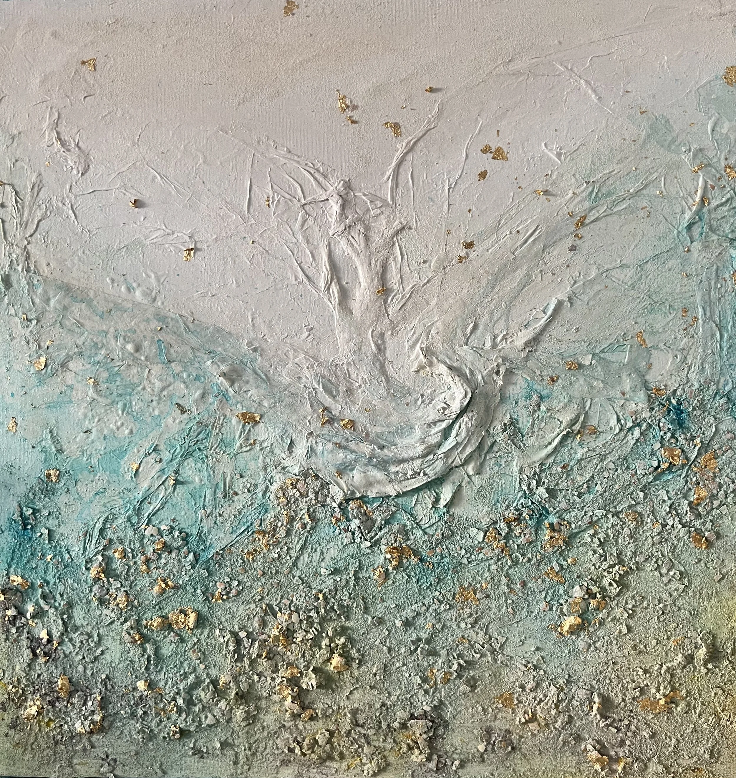 Los fragmentos dorados actúan como vértebras de luz: pequeñas revelaciones que emergen tras el oleaje interior, como si el mar rescatara lo que una vez se hundió.