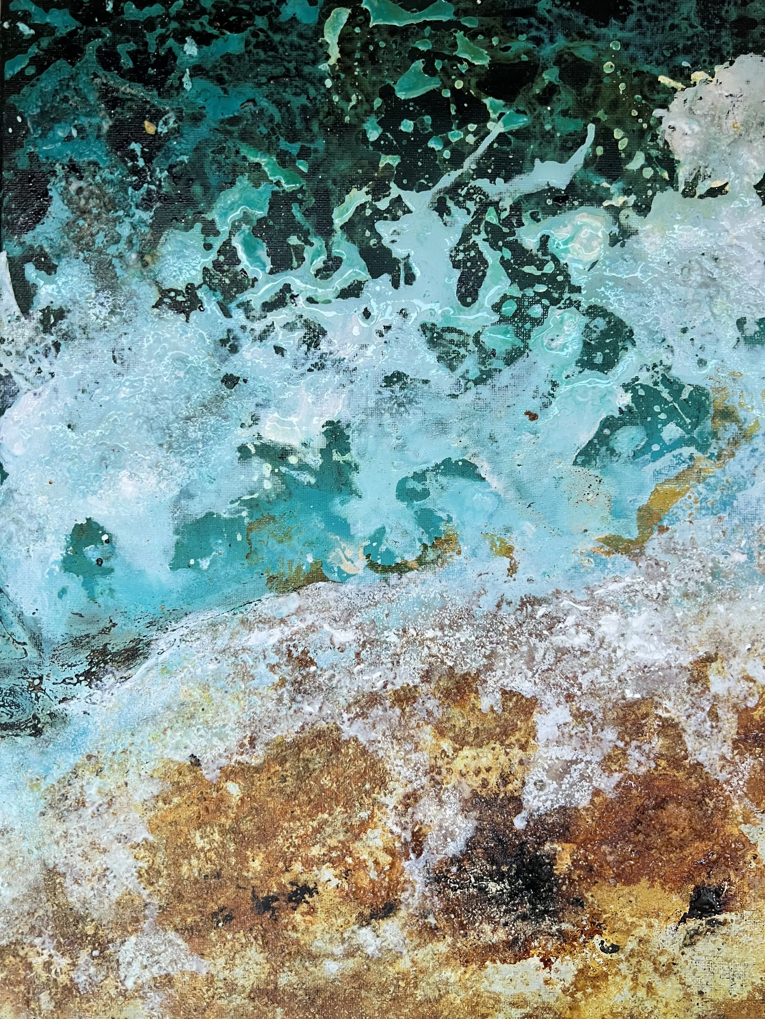 Las capas turquesas dialogan con zonas de espuma y fractura, como si la superficie guardara la vibración de un cambio inevitable.