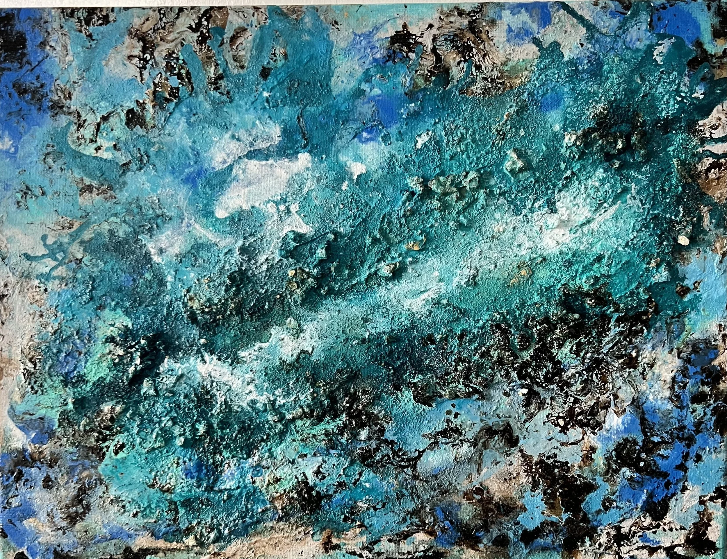 En la conversación entre los turquesas profundos y las zonas doradas y óxidas, la superficie se convierte en memoria en suspensión: fragmentos, brillos, restos que flotan un segundo antes de volver al fondo.