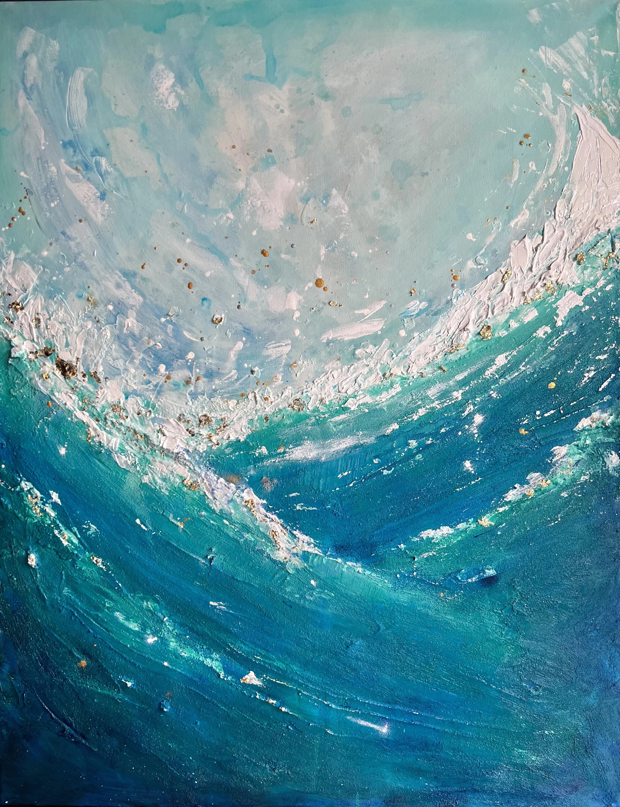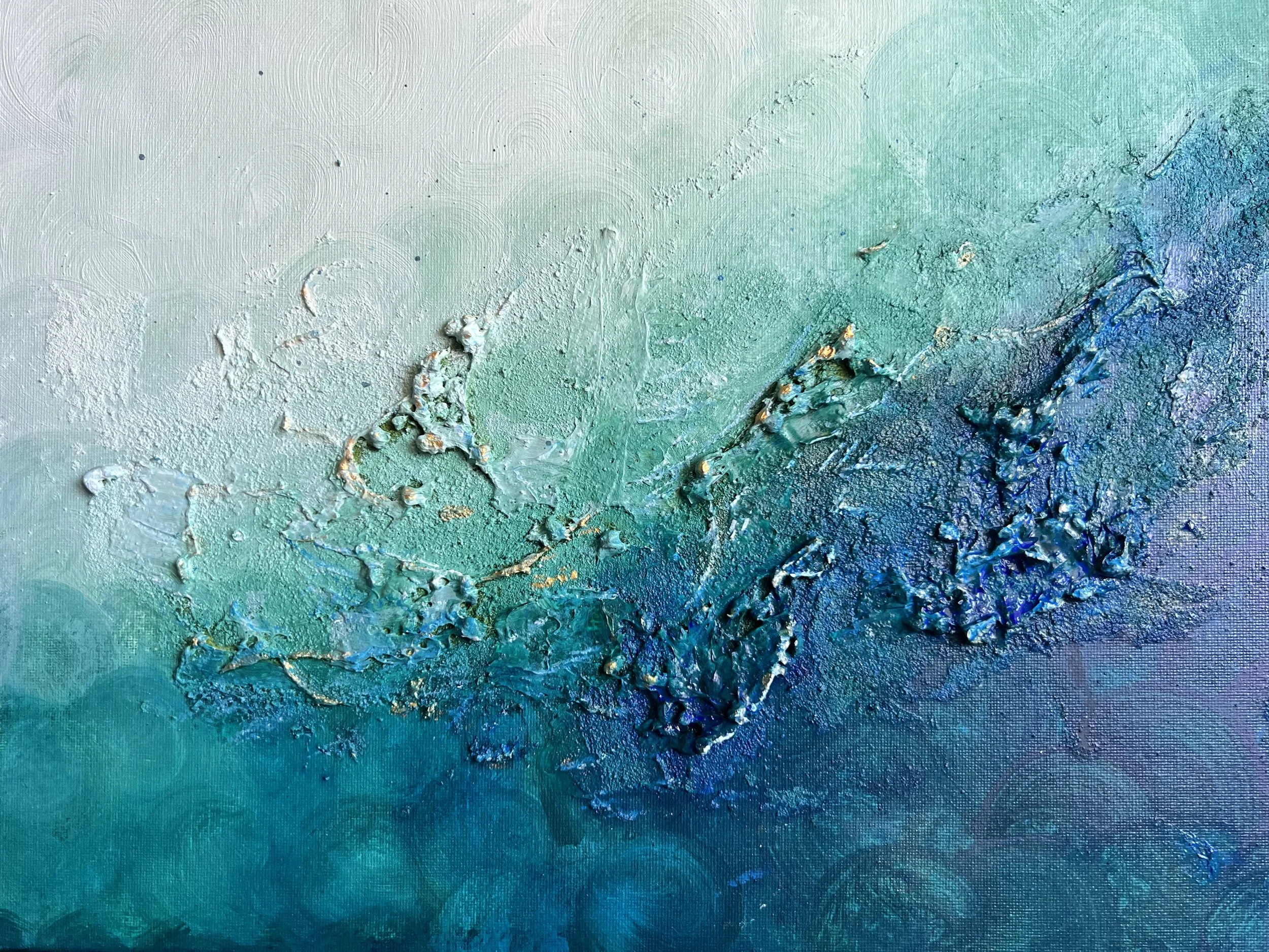 La obra nace de un movimiento interior que se expande desde la quietud luminosa hacia un territorio más profundo y vibrante. Los blancos y turquesas iniciales funcionan como una respiración contenida; una calma previa al impulso. A medida que la mirada desciende, el color se densifica, la textura se vuelve más mineral y el trazo adquiere una intensidad creciente, como una ola que reúne fuerza antes de romper.
