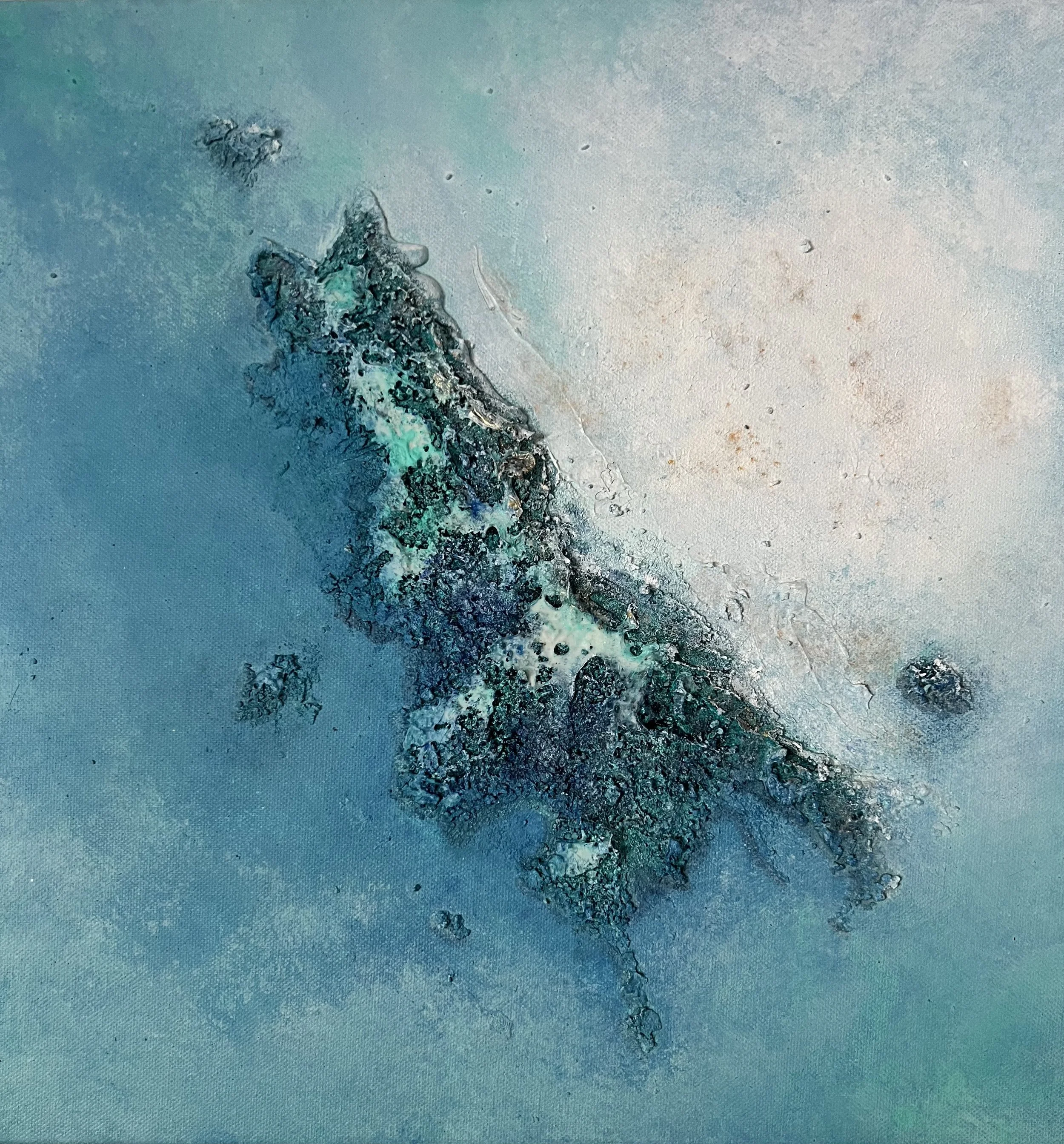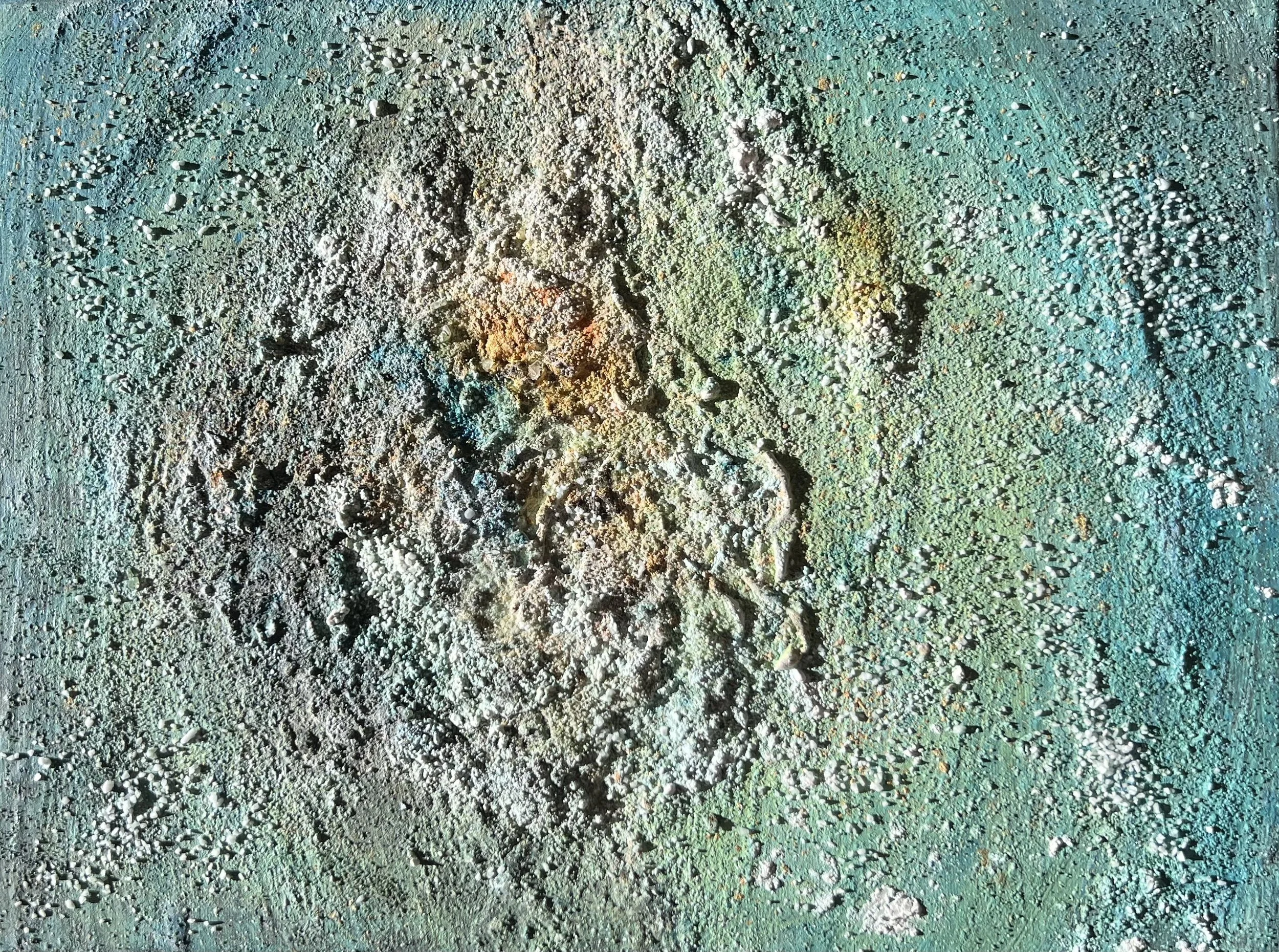 Las texturas, rugosas y delicadas al mismo tiempo, evocan la erosión lenta, la memoria del viento salino y la persistencia de la materia. La paleta, envuelta en turquesas lechosos y veladuras translúcidas, convierte la obra en un espacio de contemplación: un territorio de silencio húmedo y claridad difusa.