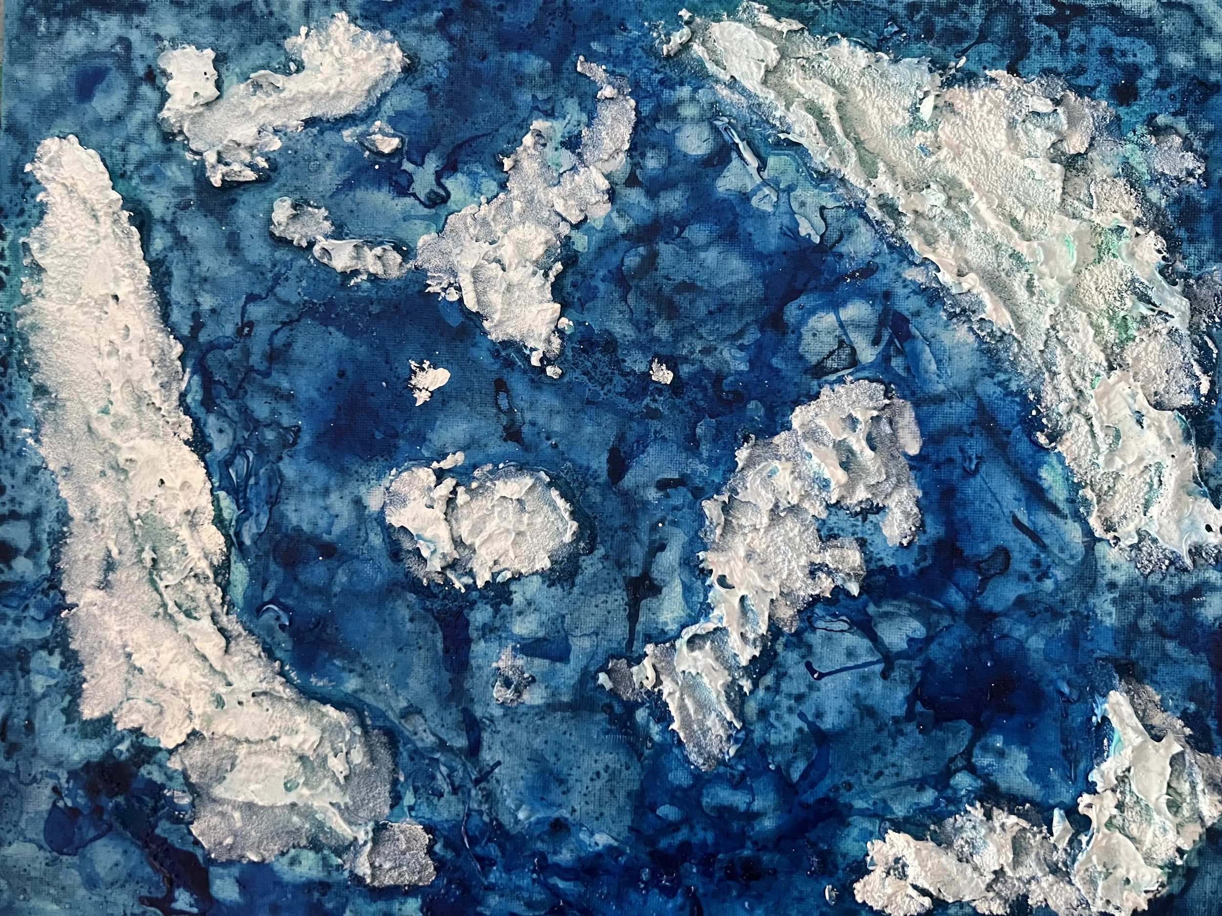 La obra funciona como una atmósfera de deshielo emocional: blancos agrietados, grises minerales y brumas azuladas que revelan un océano detenido en su propia respiración.