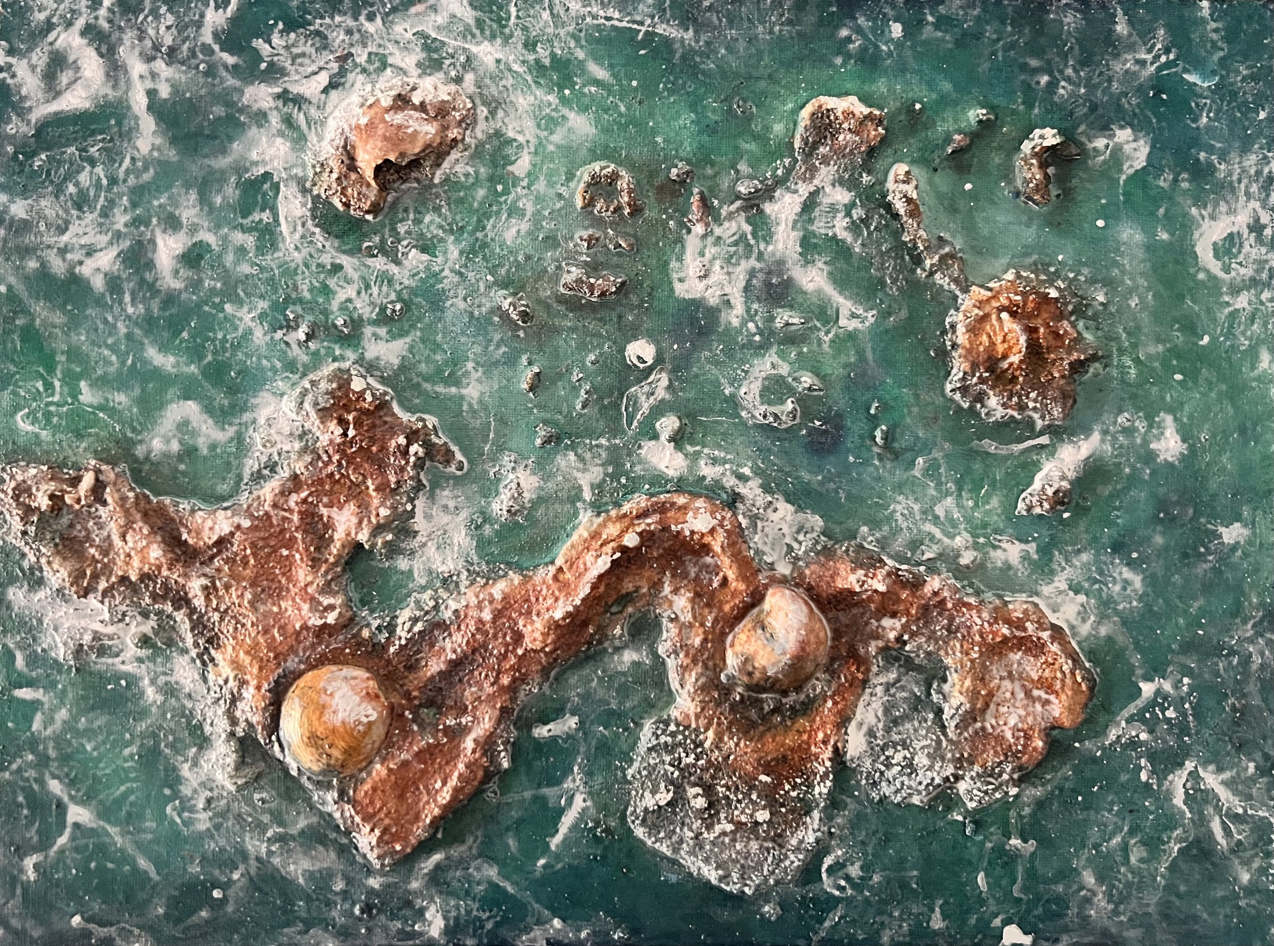La obra surge de un gesto turbulento: una corriente que arrastra piedras, líquenes y sal, y los funde con las veladuras turquesas en una única respiración. El relieve central —un cuerpo pétreo que se disgrega— funciona como un archipiélago en transformación, un organismo erosionado por la marea que nunca conserva la misma forma.