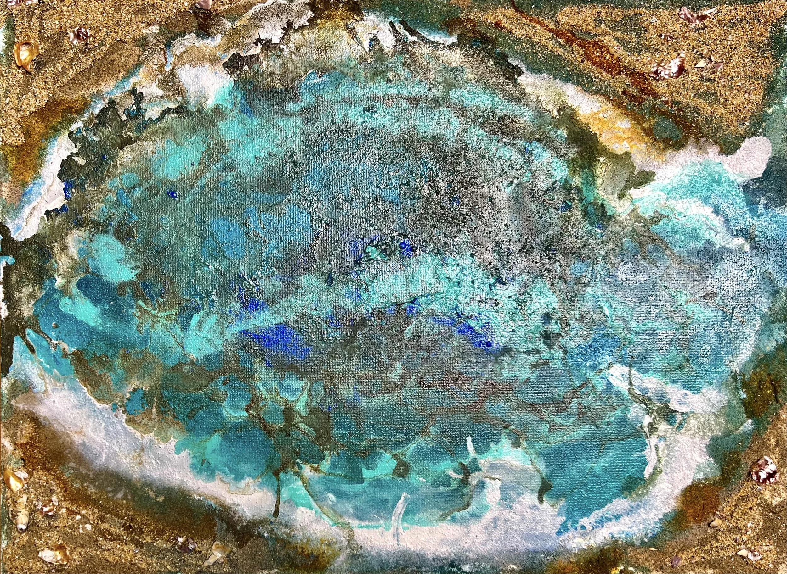 Los tonos turquesa y azules profundos recogen la densidad del océano; los brillos dorados y rosados actúan como destellos atrapados, restos de una energía que asciende desde el fondo hacia la luz.