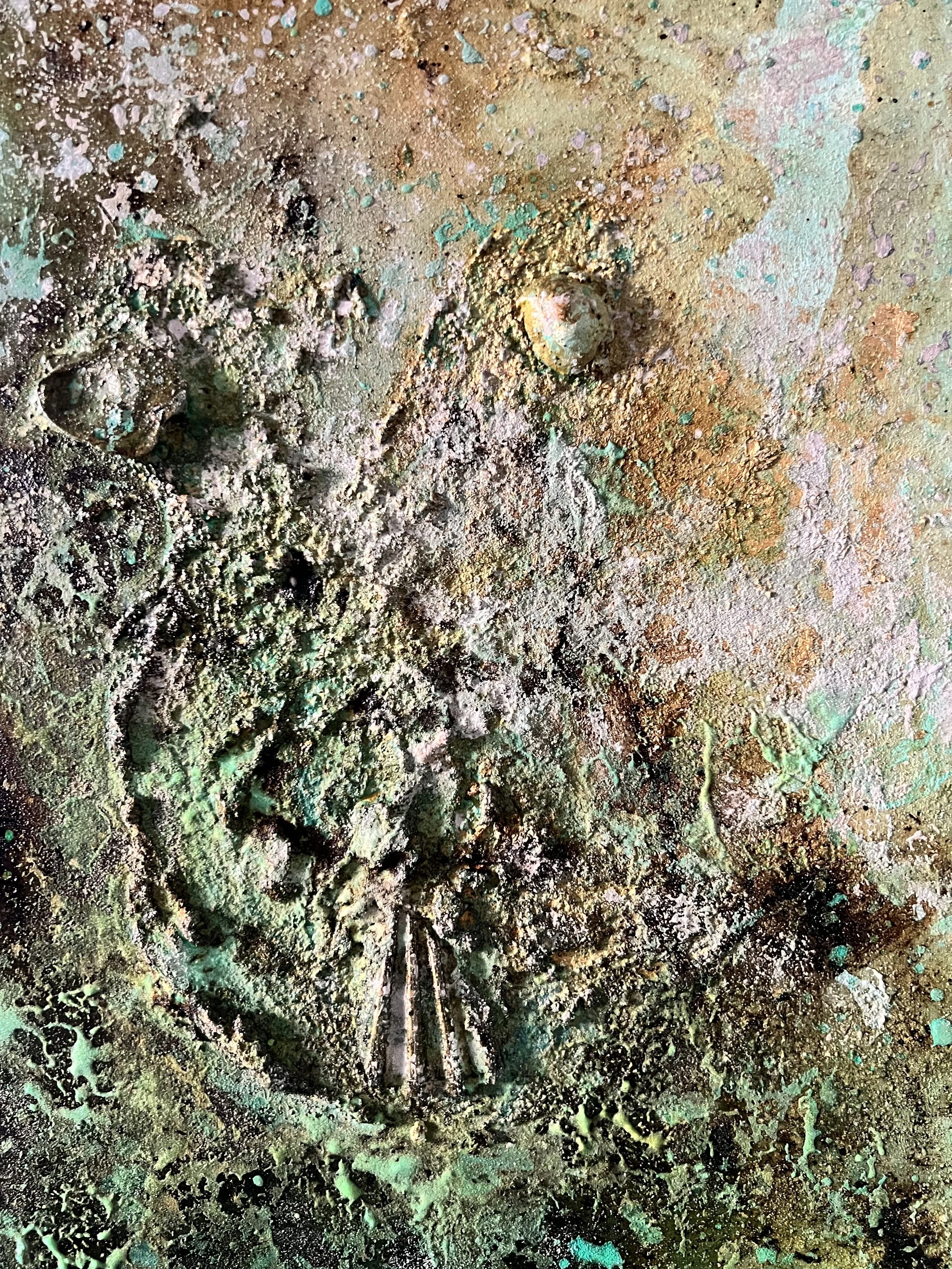 Las veladuras turquesas y los minerales erosionados construyen un paisaje suspendido: un territorio donde la luz sube desde el fondo y revela la textura antigua de lo que estuvo unido. Cada relieve funciona como huella de un vínculo primario, casi telúrico, que resiste el paso del tiempo y sigue latiendo bajo la superficie.