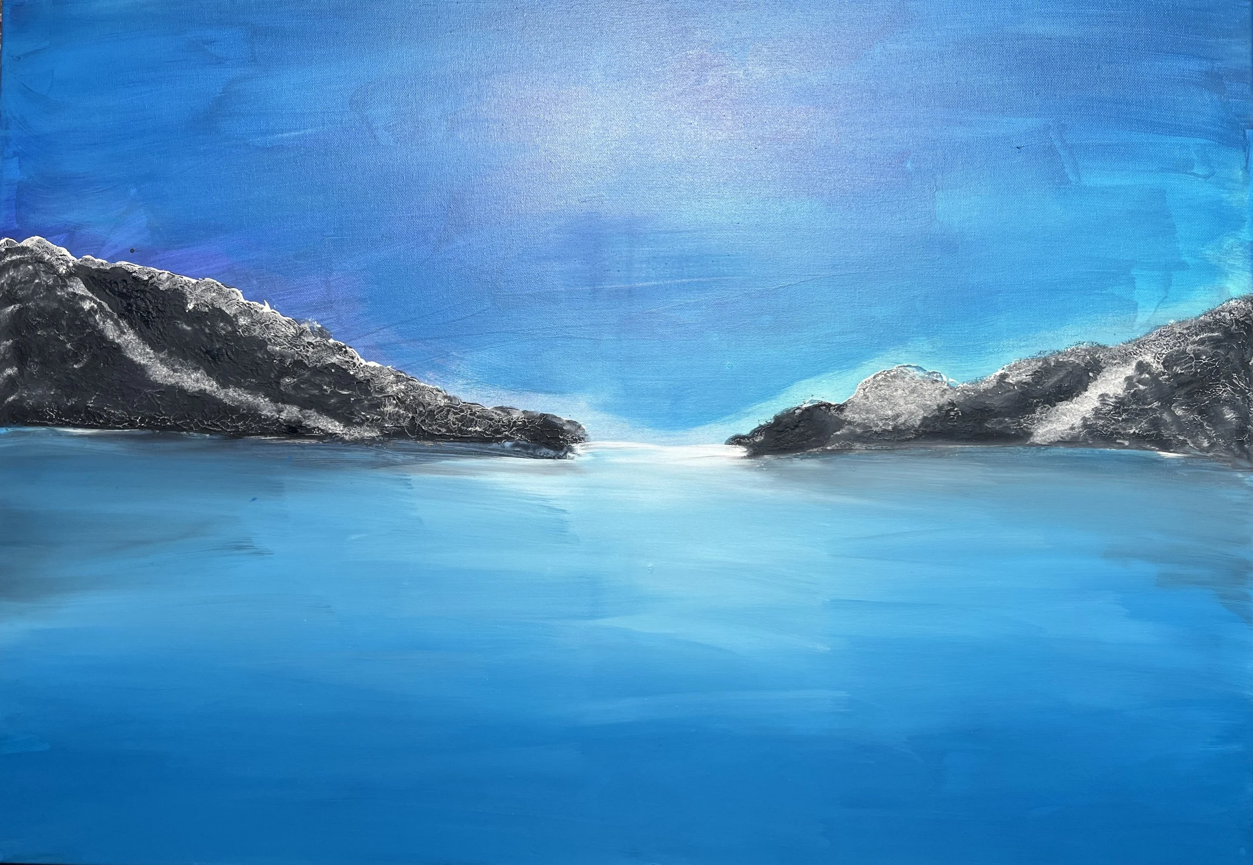 La pintura se abre como una bahía imposible —turquesa y espuma— rodeada de roca oscura, como si el océano hubiese excavado su propio refugio dentro de la materia.