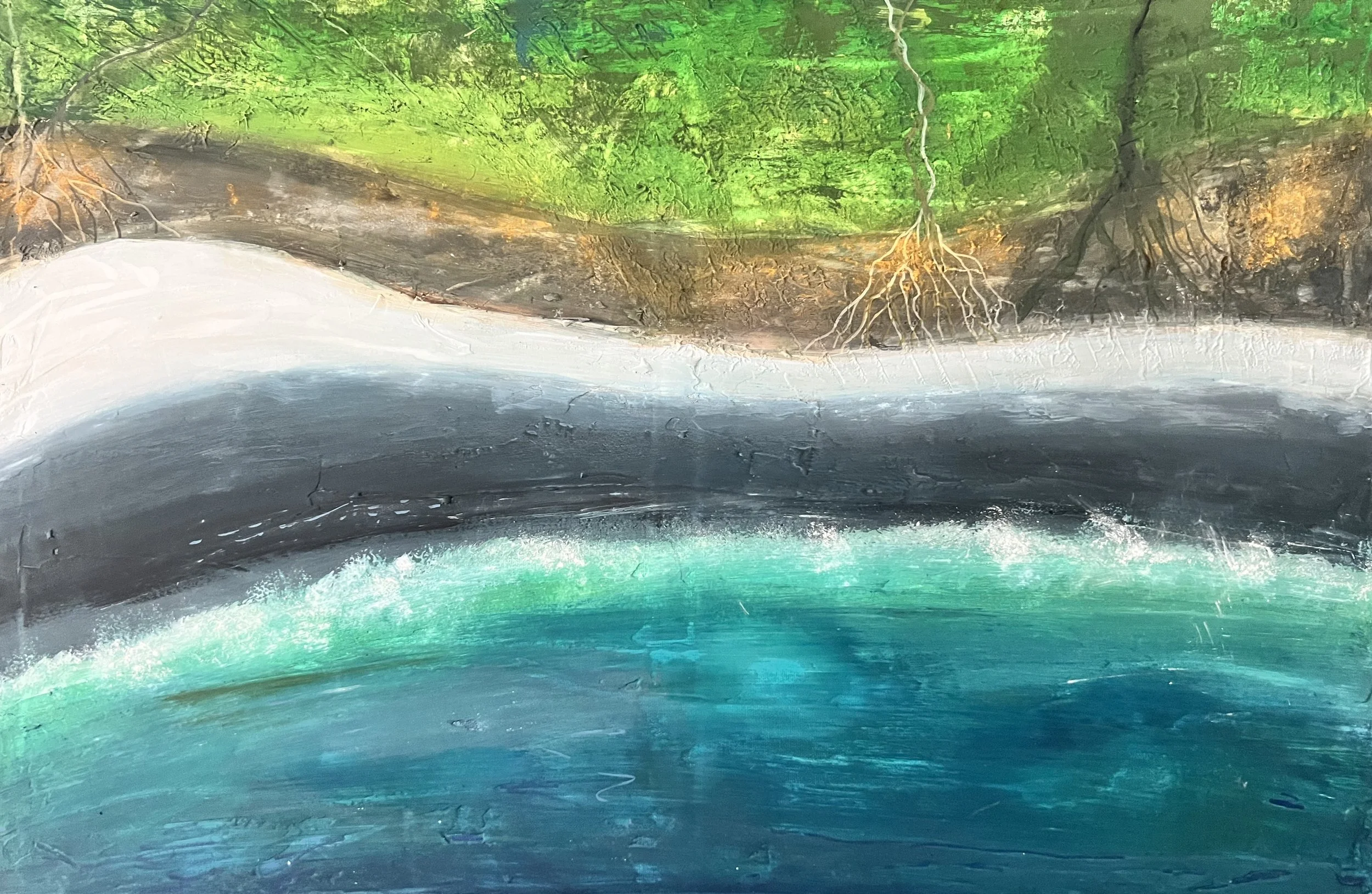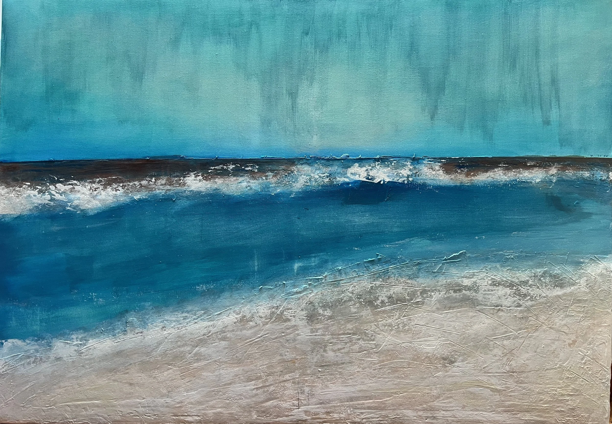 La obra funciona como un estrato emocional: una marea que avanza y retrocede dejando restos, minerales y memoria. No busca representar un paisaje, sino elpulso interior del agua, su vibración y su capacidad de transformar lo que toca.