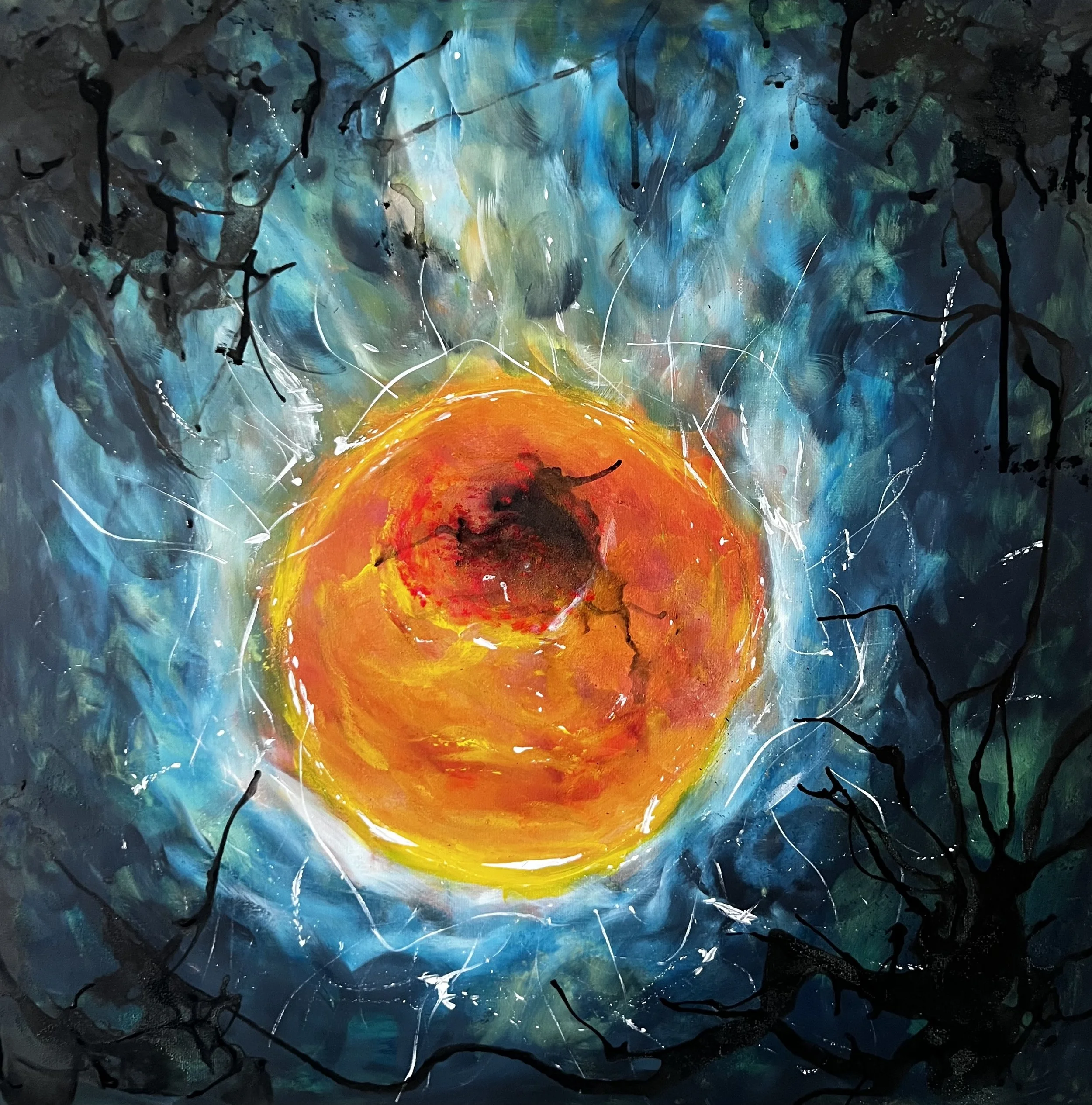 La obra se articula a partir de una estructura radial que abre la mirada desde el centro hacia un campo profundo de azules y turquesas. El contraste entre los tonos cálidos del núcleo y el entorno frío genera una tensión visual que sugiere un proceso activo de transformación.
