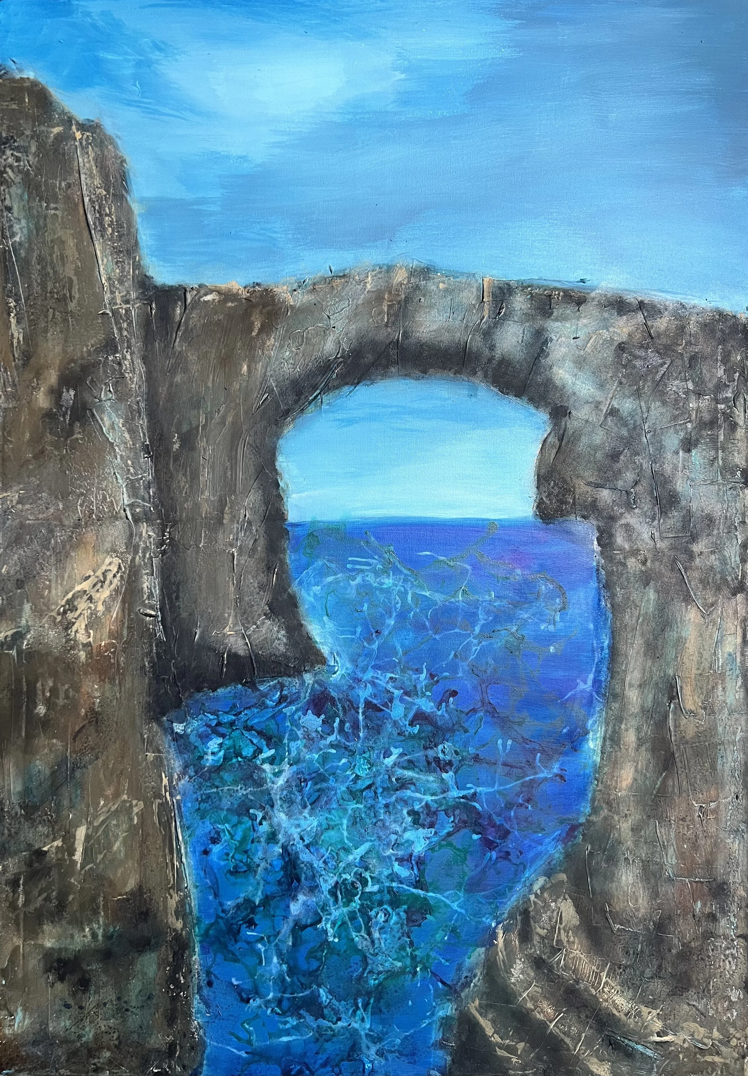 La obra se construye desde capas densas de estuco y veladuras minerales, trabajadas como estratos de tiempo. La materia se compacta, se agrieta y se aligera hasta generar una estructura casi arquitectónica, un arco natural que enmarca el mar. El azul aparece contenido, protegido, como una presencia viva que respira al fondo.