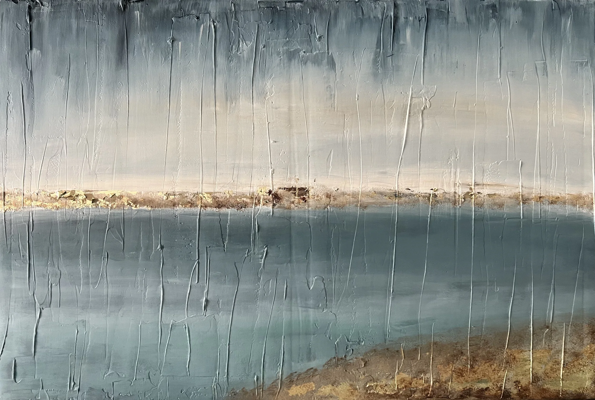 La superficie revela un ritmo de ascensos y descensos: zonas de densidad, zonas de transparencia y destellos de pan de oro que actúan como puntos de energía. No representa el mar, sino la huella que el mar deja en la materia, convertida aquí en topografía abstracta.